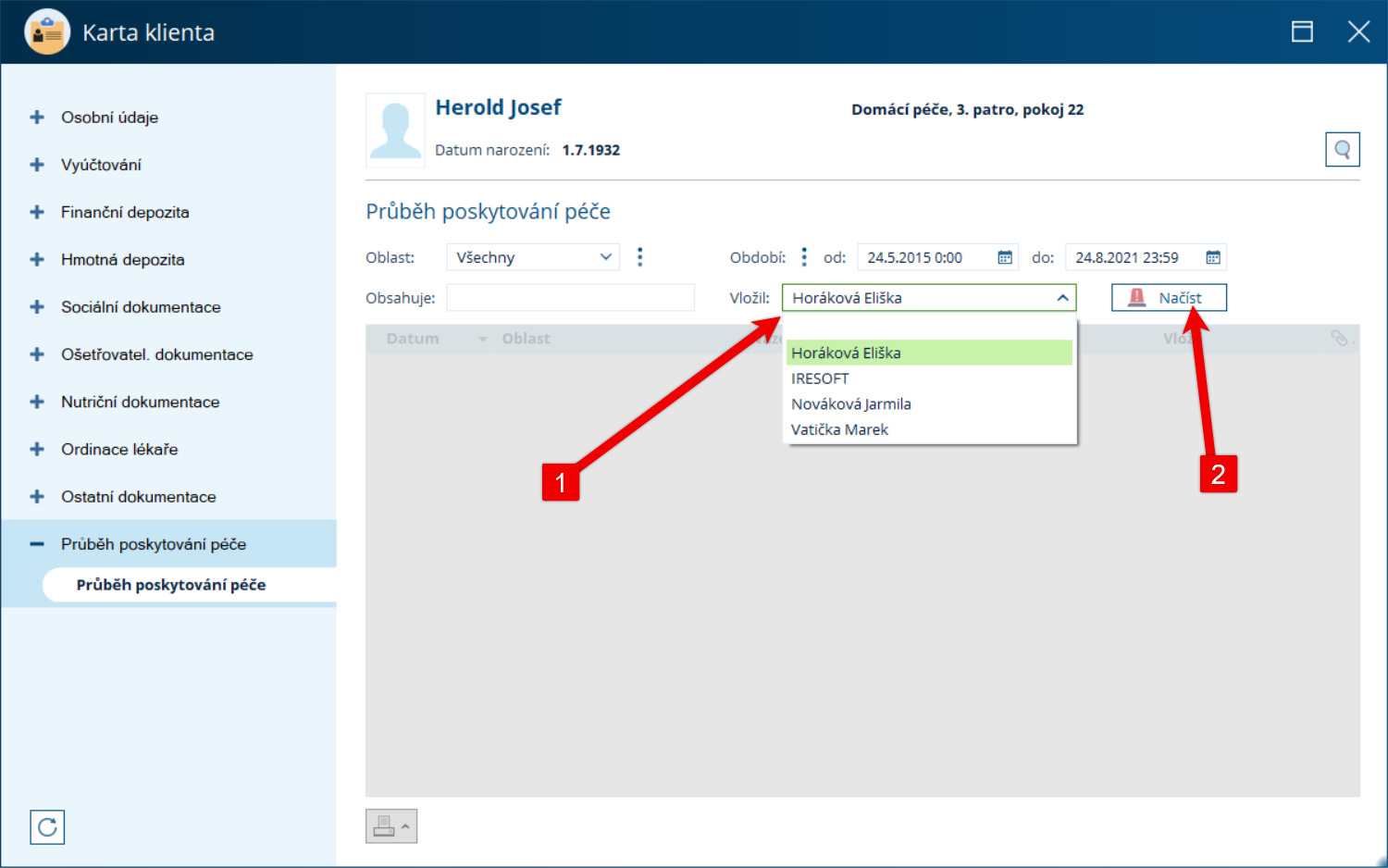 K vyhledání záznamů, které byly zapsány vybraným pracovníkem použijeme nabídku Vložil (oblasti a období již máte vybrány). Vyberte pracovníka a klepněte na Načíst.