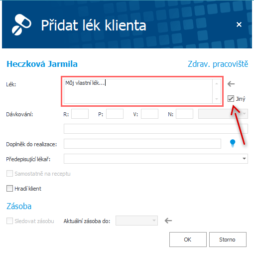 - V případě, že je úhrada léku v plné režii klienta, zatrhněte volbu Hradí klient.
