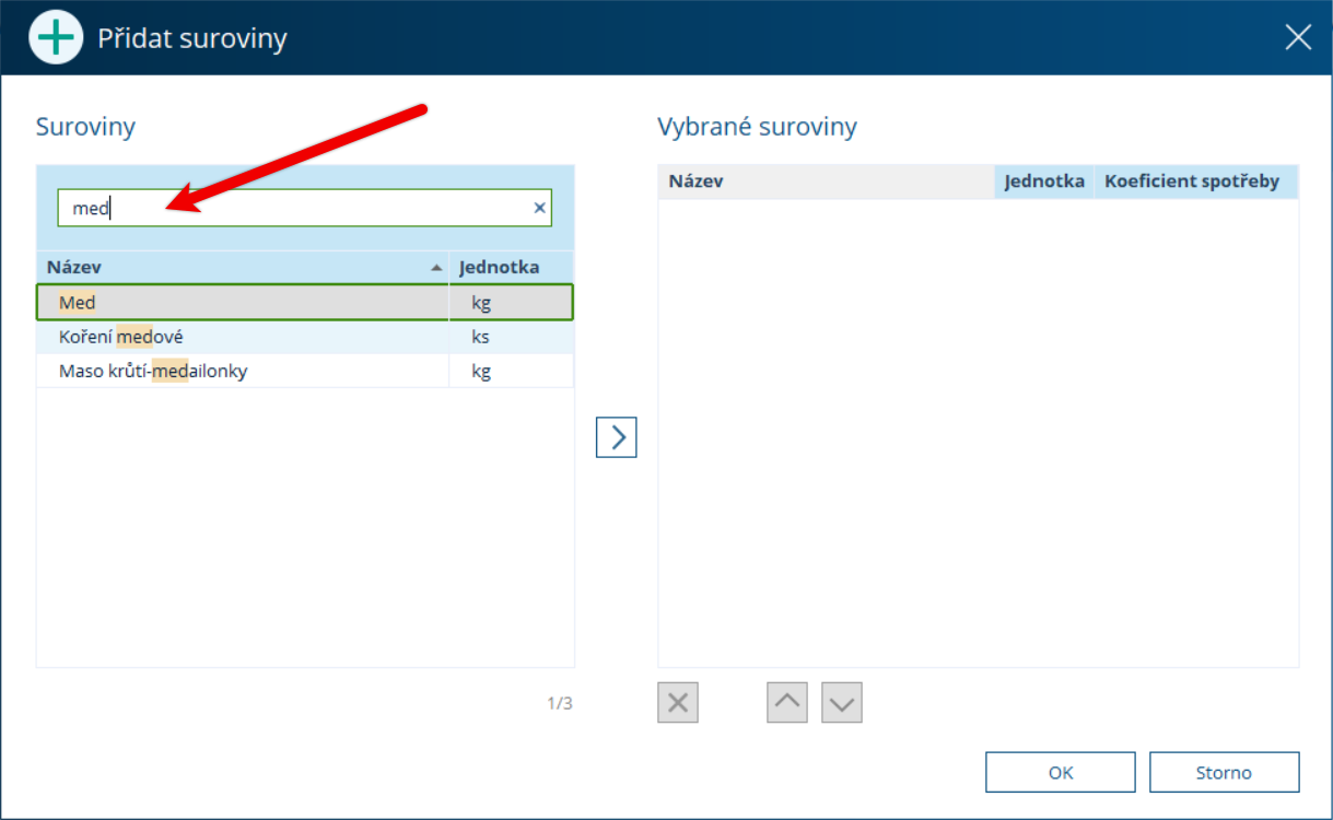 V okně Přidat suroviny, vyhledejte správnou surovinu (tj. skladová položka skladu potravin).