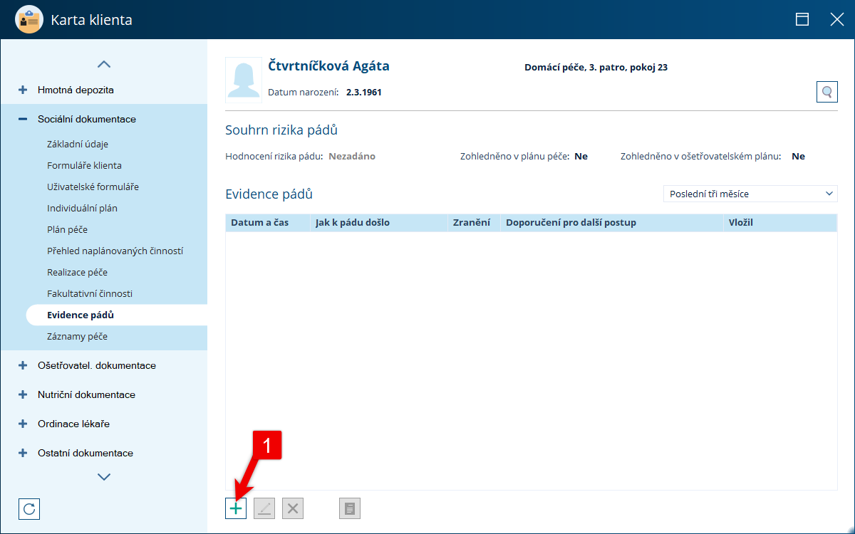 (KDE? Klienti – Karta klienta – Sociální dokumentace – Evidence pádů)