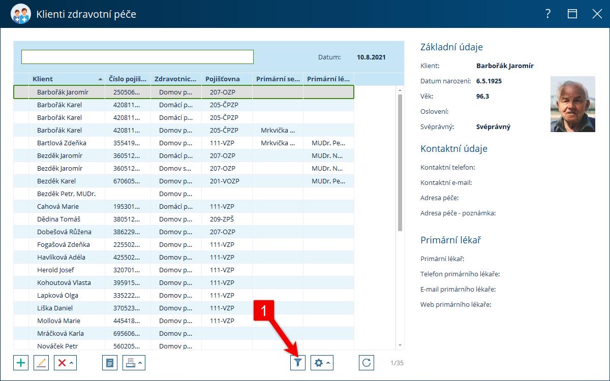 K zobrazení pouze vybraných klientů, kupříkladu klientů se stejnou pojišťovnou, použijte tlačítko Filtr.