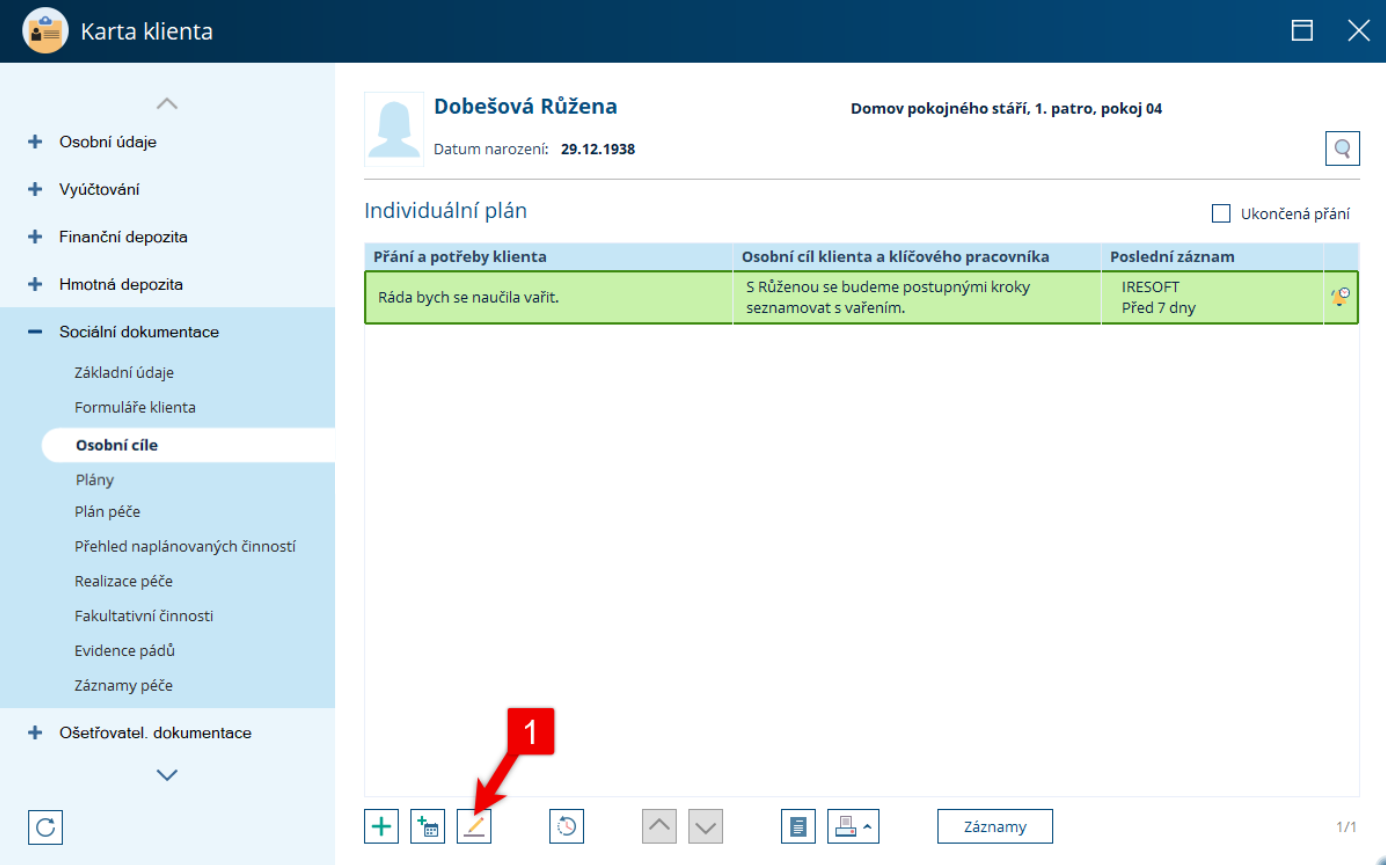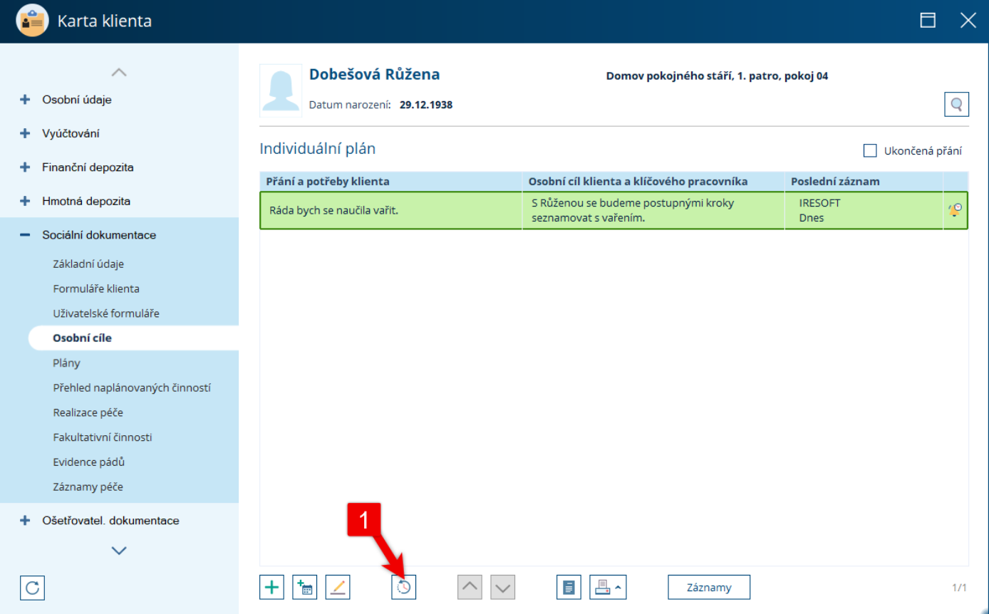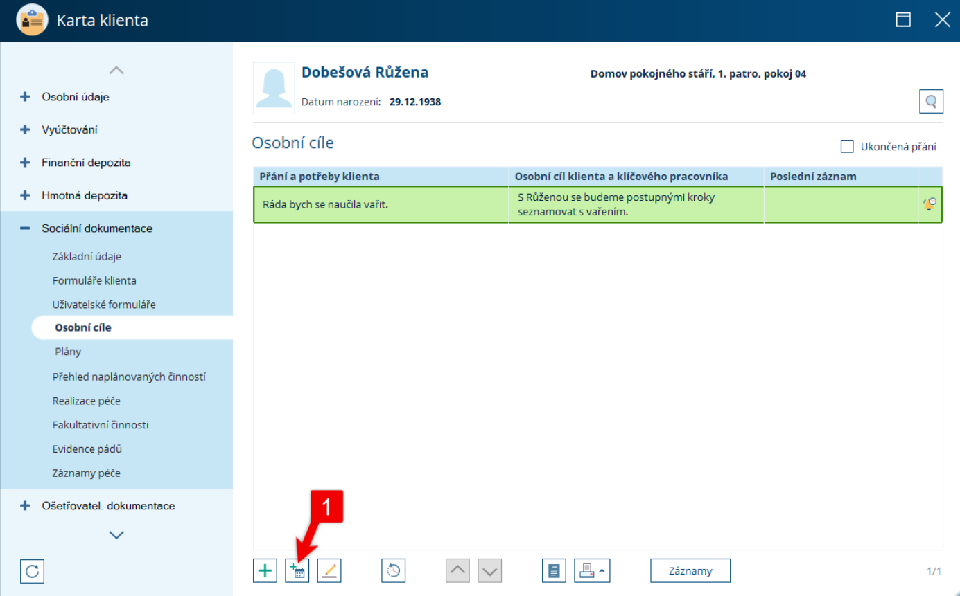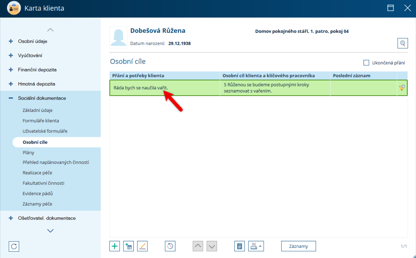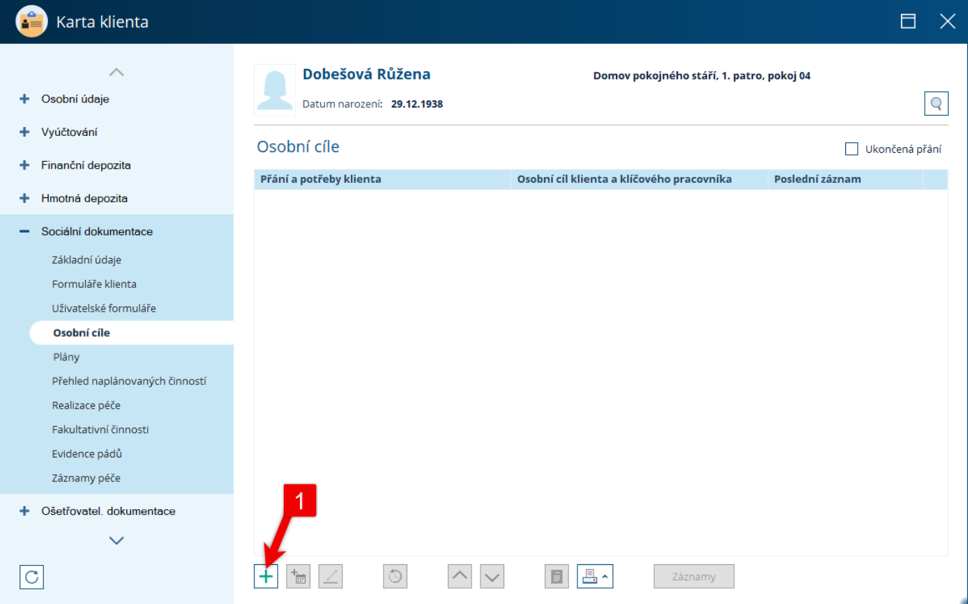 (KDE? Klienti – Karta klienta – Sociální dokumentace – Osobní cíle)