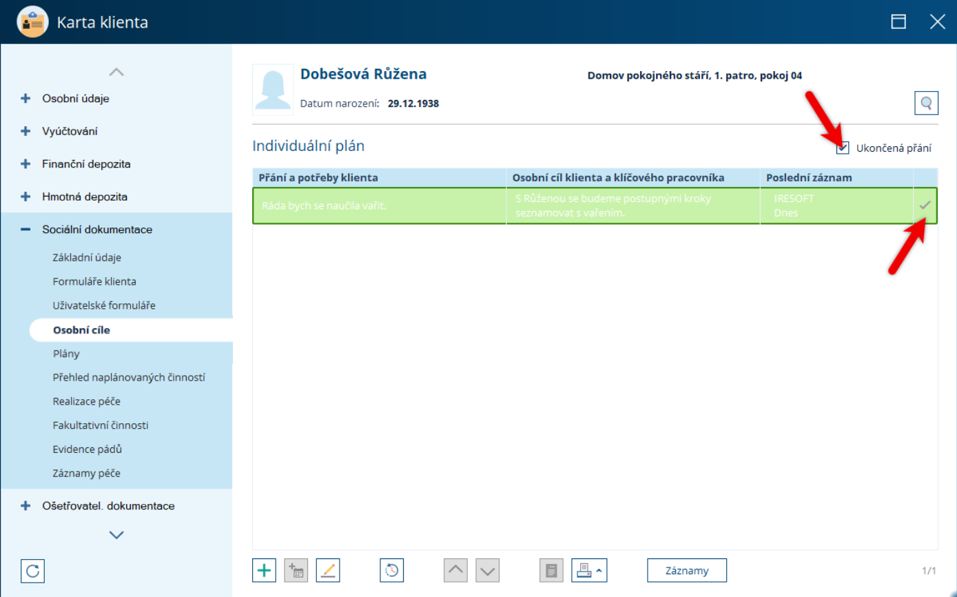 Když je cíl splněn nebo je klient ve stavu, kdy je cíl nerealizovatelný, je třeba jej ukončit. Při hodnocení proto zatrhněte volbu Označit přání jako ukončené. A uložíme klepnutím na OK.