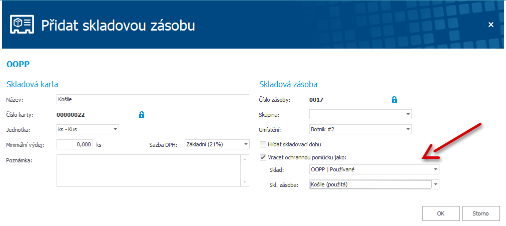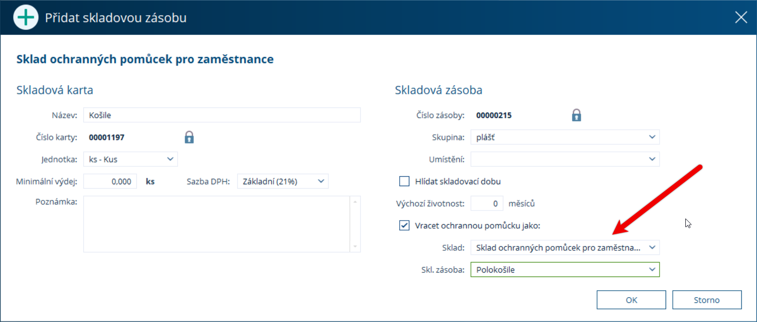 Ochranné pomůcky můžete po použití vrátit zpět na sklad. Pokud to lze, zatrhněte volbu Vracet ochrannou pomůcku jako a vybrat sklad a položku, na kterou se položka při vracení příjme.