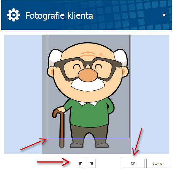 Vyřízněte obličej klienta pomocí tažením modrého rámečku a fotografii případně otočte, pokud je na bok nebo vzhůru nohama. Jakmile budete hotovo, klepněte na tlačítko OK.