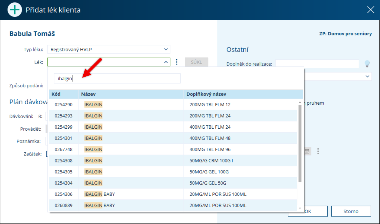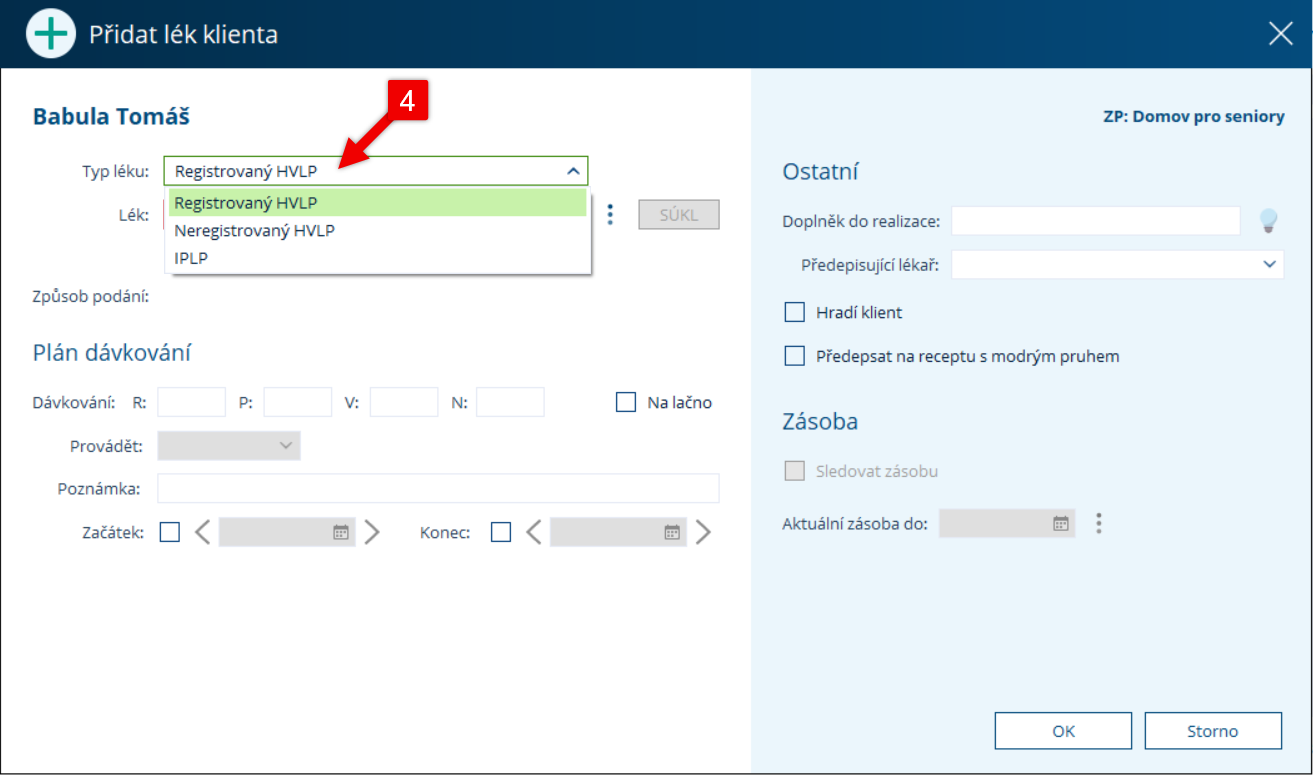 V okně Přidat lék klienta nejprve vyberte typ léku.