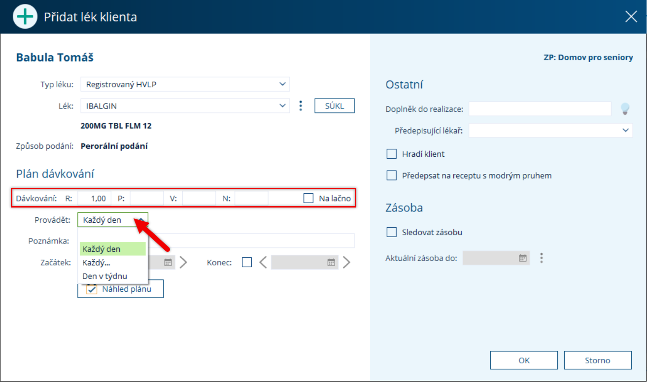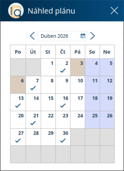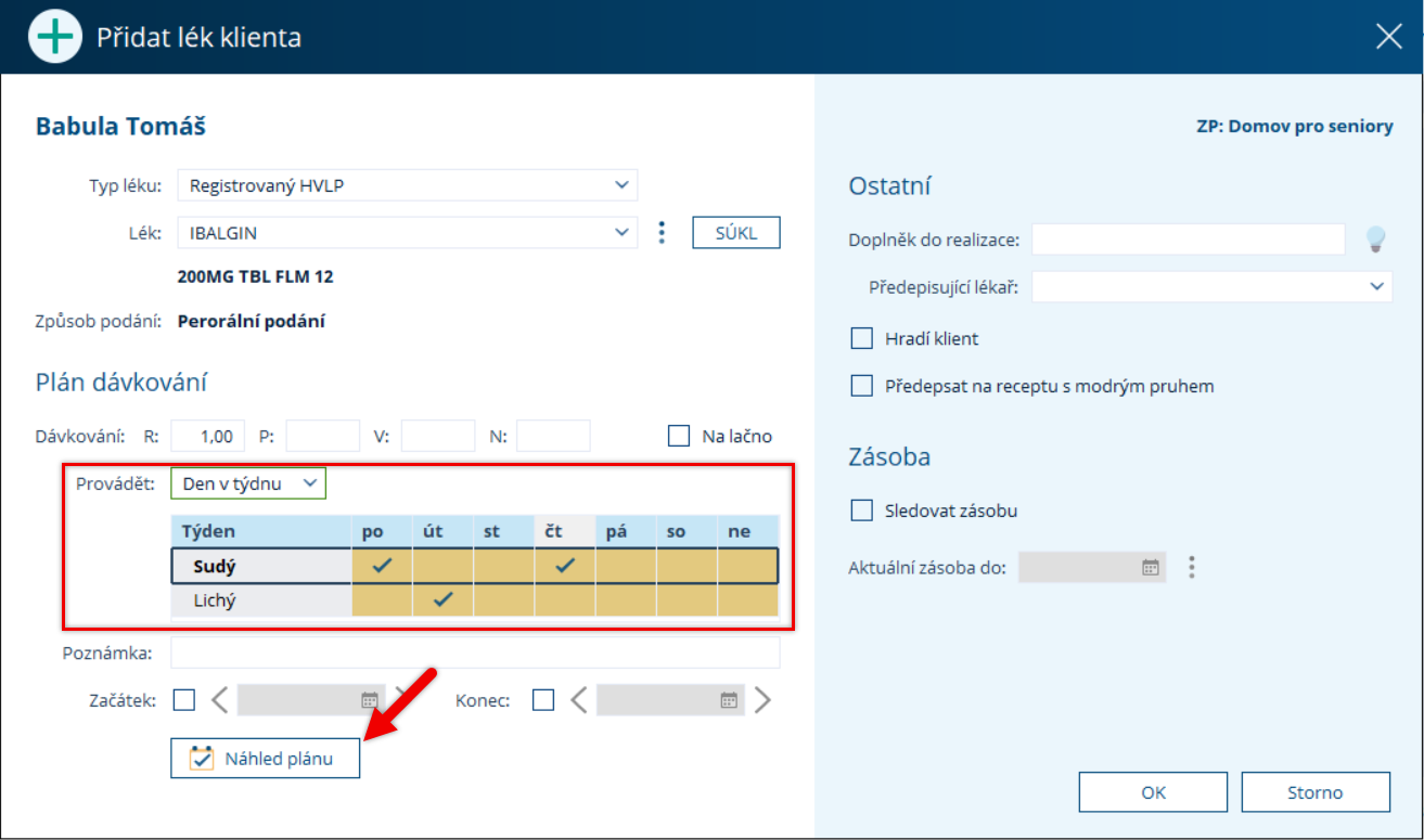 Po zadání se můžete přes tlačítko Náhled plánu podívat, které konkrétní dny budou klientovy dle nastavení léky podávány.
