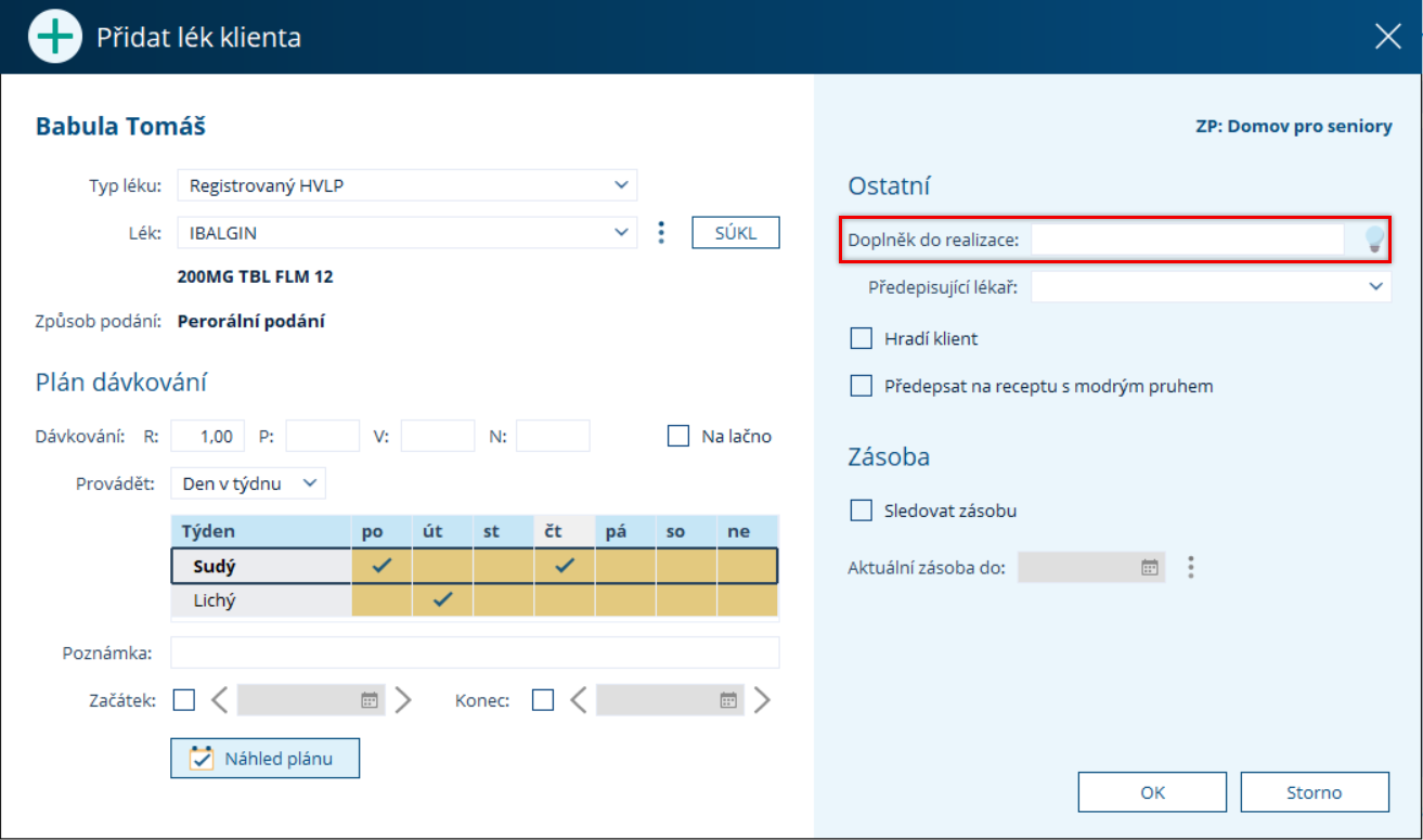 Načítáte v realizaci ošetřovatelské péče léky z medikační karty klienta a potřebujete dávku specifikovat? Zapište tuto specifikaci do pole Doplněk do realizace. Při realizaci bude v zápisu tato hodnota v závorce za podaným lékem.