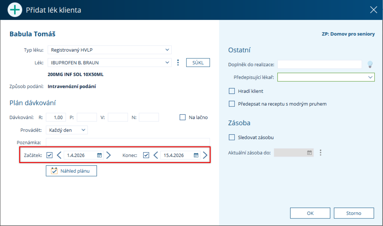 V okně přidání medikace, tak, jak jste zvyklí se nyní zobrazí i možnost od/do, kde můžete uvést platnost tohoto léku.