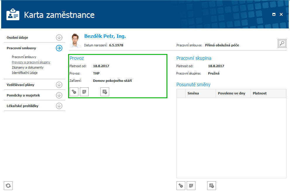 (KDE? Zaměstnanci – Karta zaměstnance – Pracovní smlouvy - Provozy a pracovní skupiny)