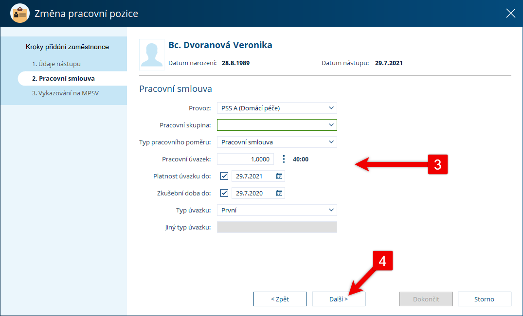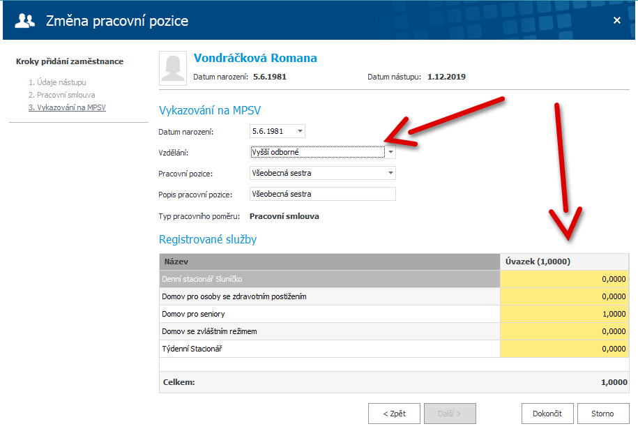 Posledním krokem jsou údaje pro vykazování dat na MPSV. Vyplňte potřebné údaje o zaměstnanci a nezapomeňte rozdělit úvazek na jednotlivé poskytované služby, je-li jich více.