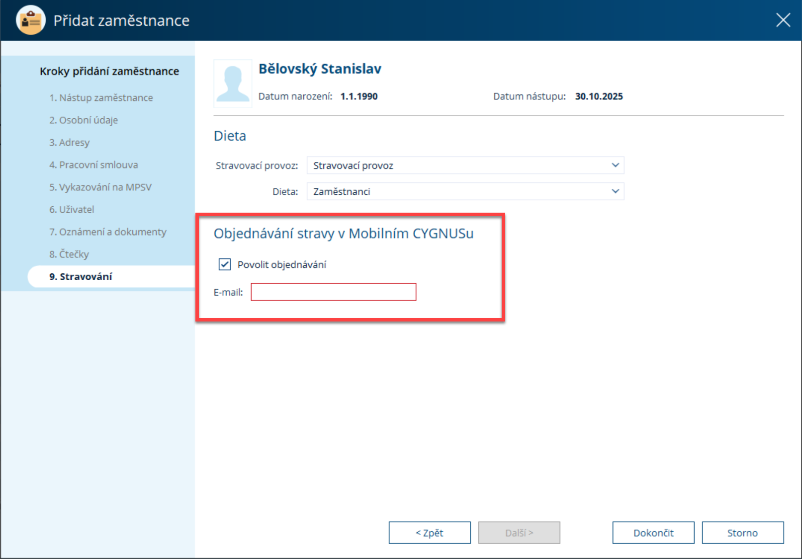 Dále je také potřeba, aby zaměstnanec měl nastaven stravovací provoz a dietu a povoleno objednávání stravy na kartě zaměstnance. Toto je možné nastavit již při nástupu zaměstnance v posledním bodu nástupu. Zaměstnanci tak bude zřízen přístup do Mobilního CYGNUSu, který je vázaný na jeho emailovou adresu, proto je emailová adresa povinný údaj. Více o Mobilním CYGNUSu a jeho nastavení se dozvíte ZDE.