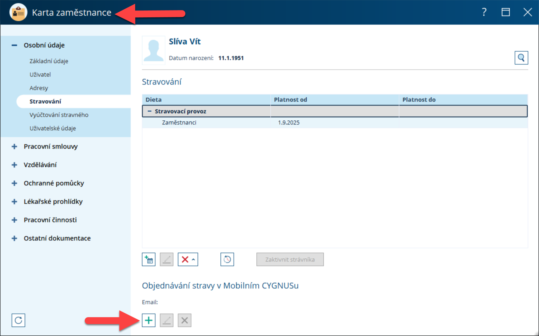 Pokud nepovolíte objednávání stravy v Mobilním CYGNUSu již při nástupu zaměstnance, můžete to dodatečně povolit na kartě zaměstnance nebo i na kartě strávníka. V obou případech bude nutné vyplnit emailovou adresu, na kterou bude přístup do Mobilního CYGNUSu navázán.