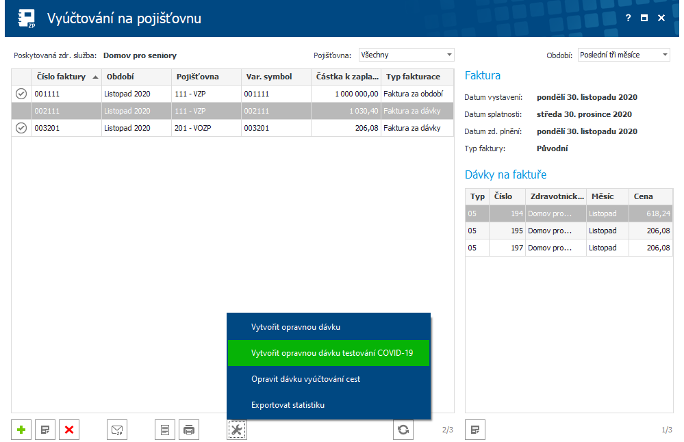 Vykázáním vybraného období automaticky vznikne také faktura, která bude obsahovat výkony testování. Pokud testujete klienty i zaměstnance i cizí osoby, vznikne faktura se třemi dávkami typu 05. Jedna bude obsahovat zaměstnance a u nich vykázané výkony 99947 nebo 99949, druhá klienty/pacienty a u nich vykázané výkony 99946 nebo 99949 a třetí cizí osoby a u nich vykázané výkony 99949.