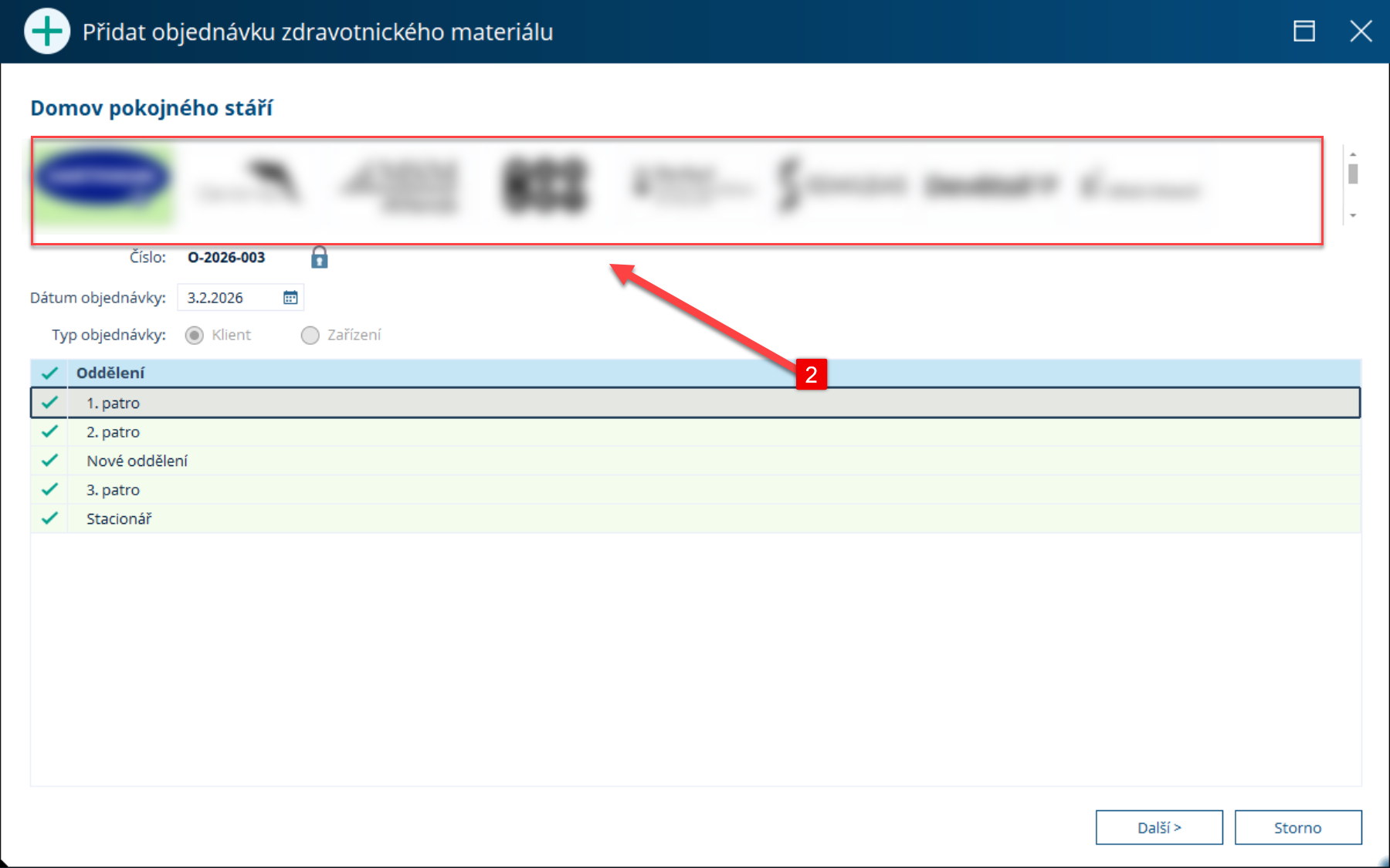 Zvolíte dodavatele, datum objednávky, případně i na které oddělení objednávku tvoříte a kliknete na další.