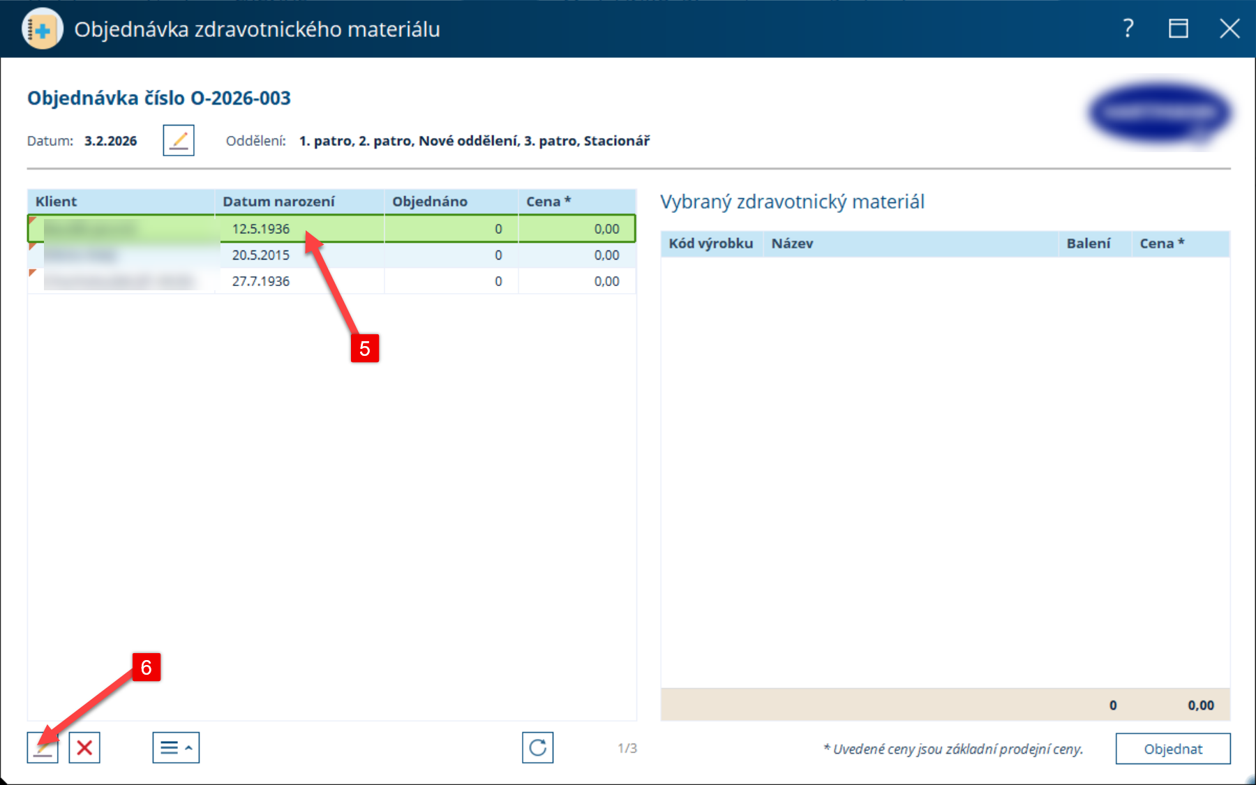 Při první objednávce zdrav. materiálu je potřeba přidat klienty do objednávky kliknutím na tlačítko Operace >Hromadně přidat klienty. (v dalších objednávkách bude předvyplněno automaticky).