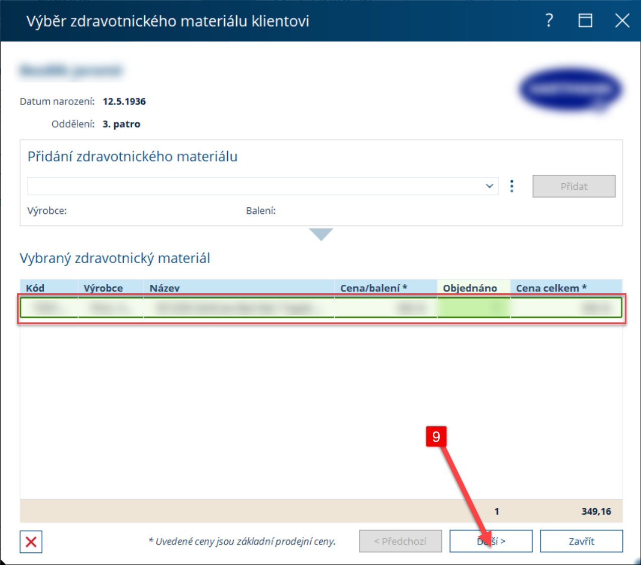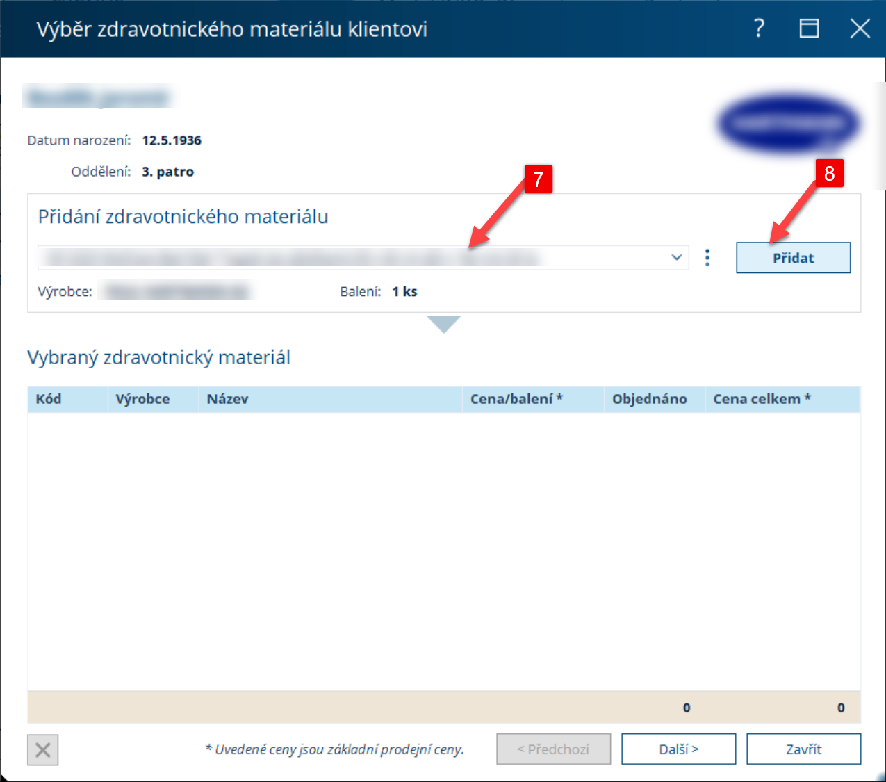 Položka se přepíše do kolonky Vybraný zdravotnický materiál.