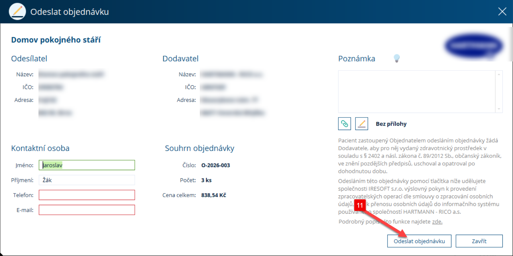 V následujícím okně doplňte kontaktní údaje (telefon. email) a kliknete na Odeslat objednávku.