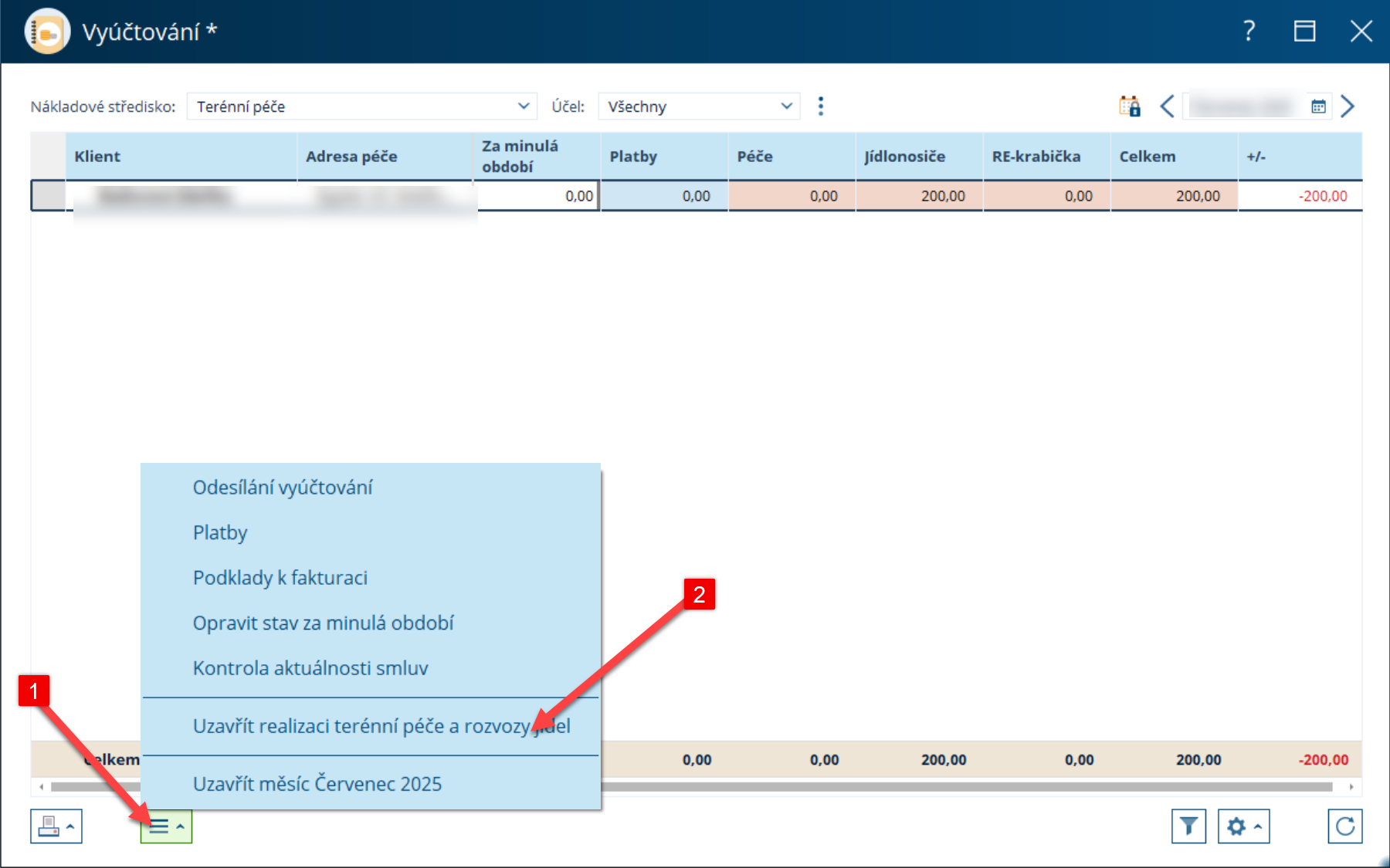 Samotné uzavření provedete následovně. V pravém horním rohu vyberte požadovaný měsíc, klikněte na Operace a zvolte Uzavřít realizaci terénní péče a rozvozy jídel.