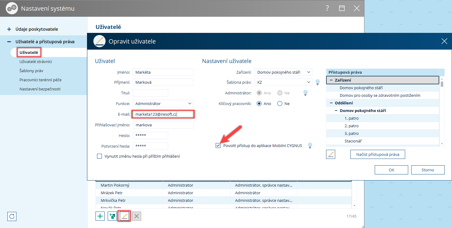 2. Na kartě uživatele doplňte e-mail a zatrhněte volbu Povolit přístup do aplikace MobilniCYGNUS.cz