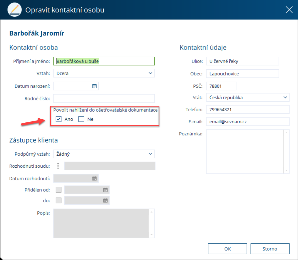 Důležité! Pokud vybíráte k nahlížení kontaktní osobu, je potřeba, aby bylo vybráno zatržítko "Povolit nahlížení do ošetřovatelské dokumentace."