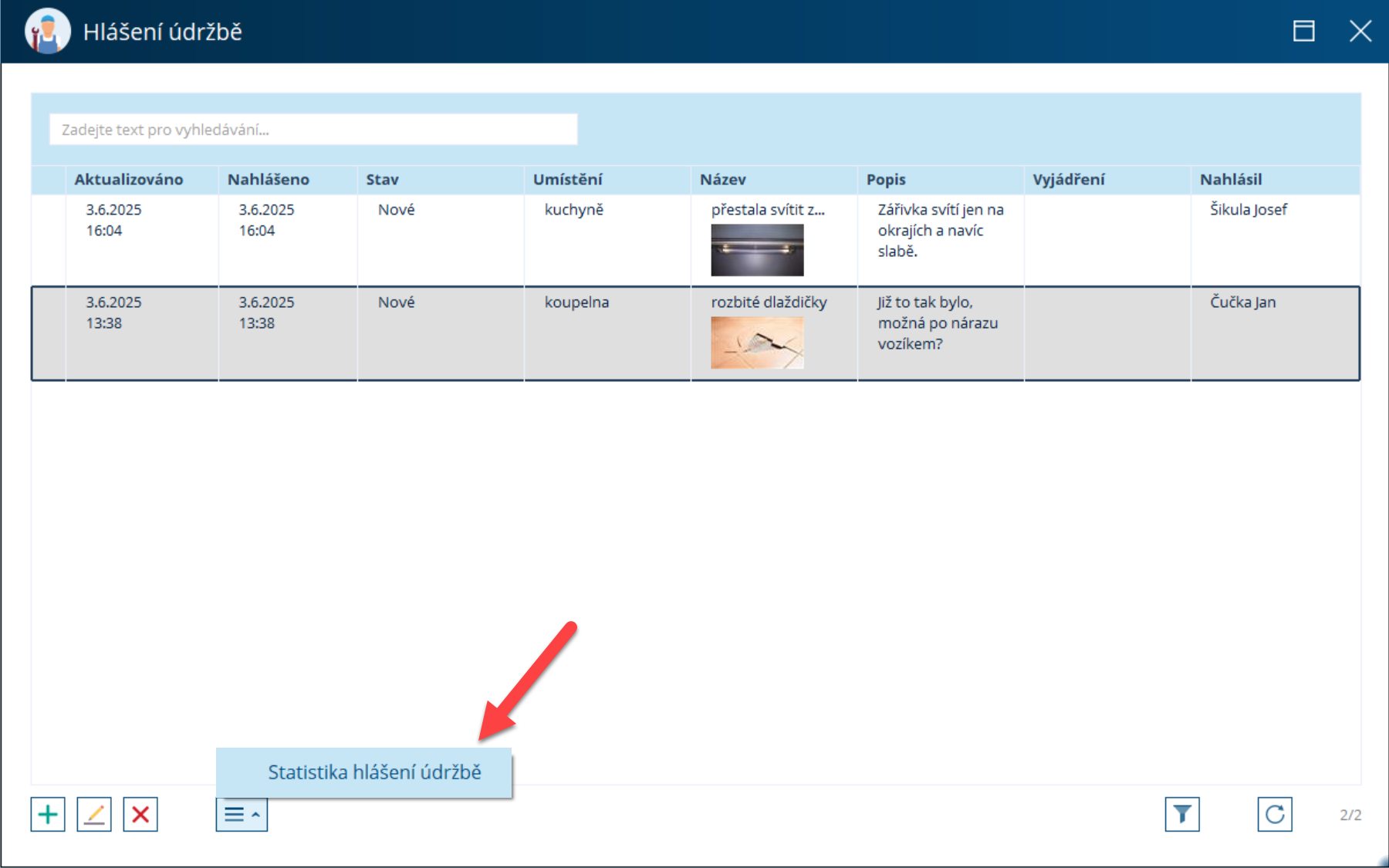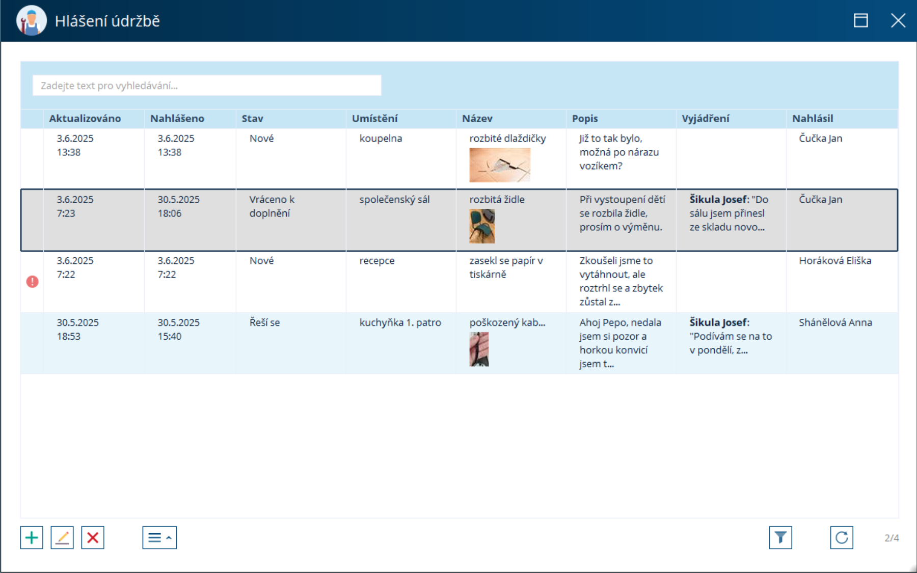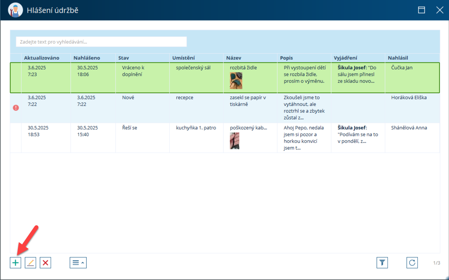 V okně Hlášení údržbě vidíme seznam všech hlášení, která jsou v současné chvíli aktivní a nejsou zatím vyřešená. V přehledu vidíme, kdo a kdy hlášení nahlásil, v jakém je stavu a kde se závada nachází. Havarijní hlášení jsou označena červeným vykřičníkem, signalizuje to problém, který je třeba řešit akutně. Nové hlášení přidáme pomocí zeleného pluska.