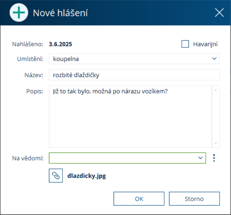 Dále můžeme přidat popis závady, vybrat další osoby mimo údržbu, kterým chceme dát závadu na vědomí, označit závadu jako havarijní (vyžadující přednostní vyřešení), či přidat fotografie nebo další přílohy kliknutím na ikonu kancelářské sponky. Vyplněné hlášení odešleme pomocí OK. Oznámení o hlášení bude doručeno těm, kteří mají právo k přijímání Hlášení a těm osobám, které byly vybrány v sekci Na vědomí.