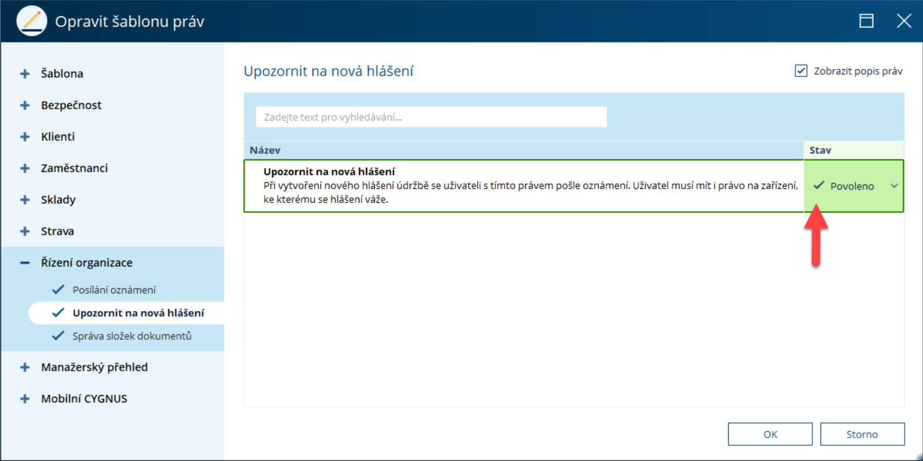 Pro správné fungování hlášení je potřeba, aby ti, kterým má hlášení chodit, byli uživatelé programu CYGNUS (tj. musí mít přístup do programu). Každý uživatel, který má v sekci Přístup k datům alespoň jedno zařízení, má možnost otevřít sekci s hlášeními. Pokud chceme, aby uživateli jakékoliv hlášení údržby přišlo formou oznámení, je potřeba na jeho šabloně práv povolit právo Upozornit na nová hlášení v sekci Řízení organizace.
