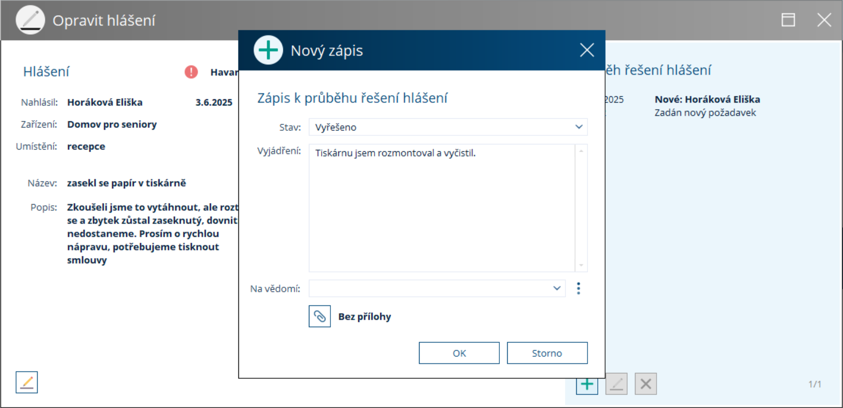 Otevře se nám okno, kde můžeme změnit stav, popsat řešení, uvědomit konkrétní osobu, přiložit fotografie či dokumenty a potvrdit pomocí OK. Pokud změníme stav hlášení na Vyřešeno, hlášení z přehledového okna zmizí, protože v přehledovém okně se ukazují pouze aktivní hlášení.