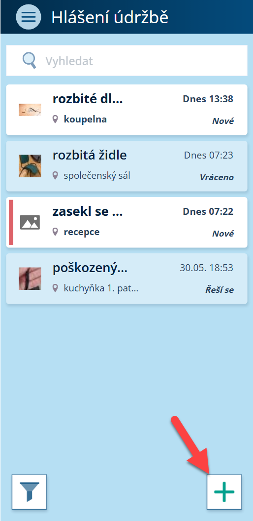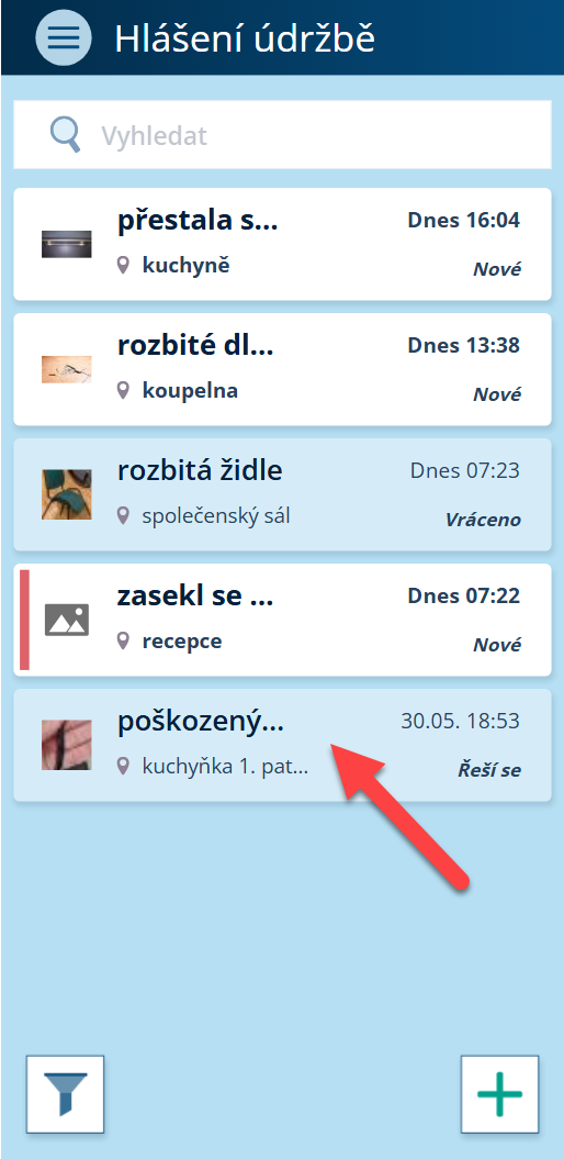 Tip: Již vyřešená hlášení se dají vyfiltrovat. Ikonu filtru naleznete v pravém spodním rohu přehledu hlášení.