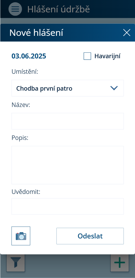 V novém hlášení můžeme vyplnit Umístění, Název a Popis. Přidat můžeme obrazovou přílohu pomocí ikony fotoaparátu či uvědomit další osoby. Pokud nám chybí nějaké umístění, můžeme si ho v roletkovém menu zadat.
