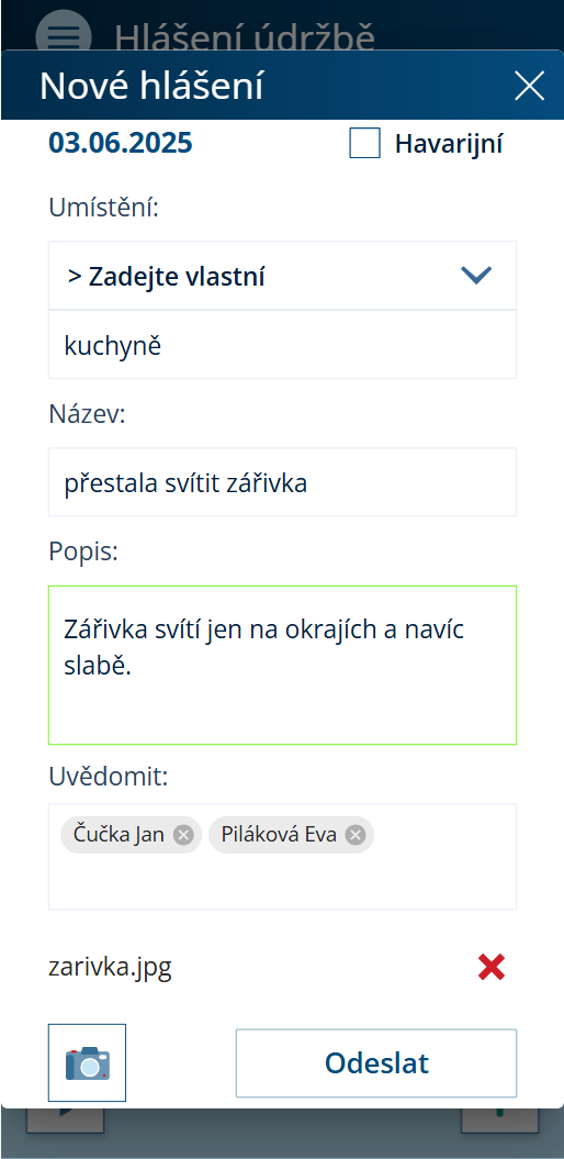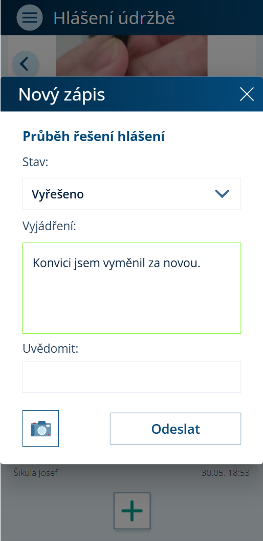 Do zápisu uvedeme stav, popis či osoby, které chceme uvědomit o řešení hlášení. Můžeme také vložit fotografie pomocí ikony fotoaparátu. Tlačítkem Odeslat potvrdíme hlášení.
