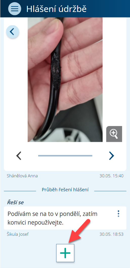 Pod fotografiemi jsou jednotlivé záznamy z Průběhu řešení hlášení. Nový zápis přidáme pomocí zeleného pluska.