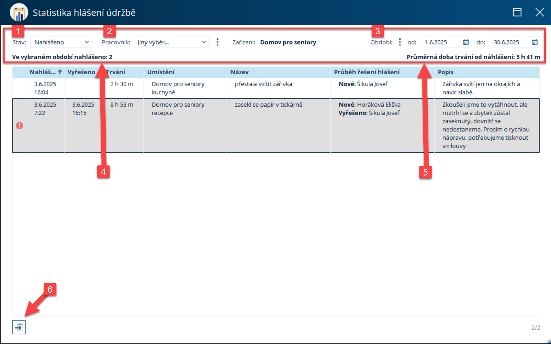 - Průměrná doba trvání – zprůměruje dobu řešení všech hlášení za stanovené období.