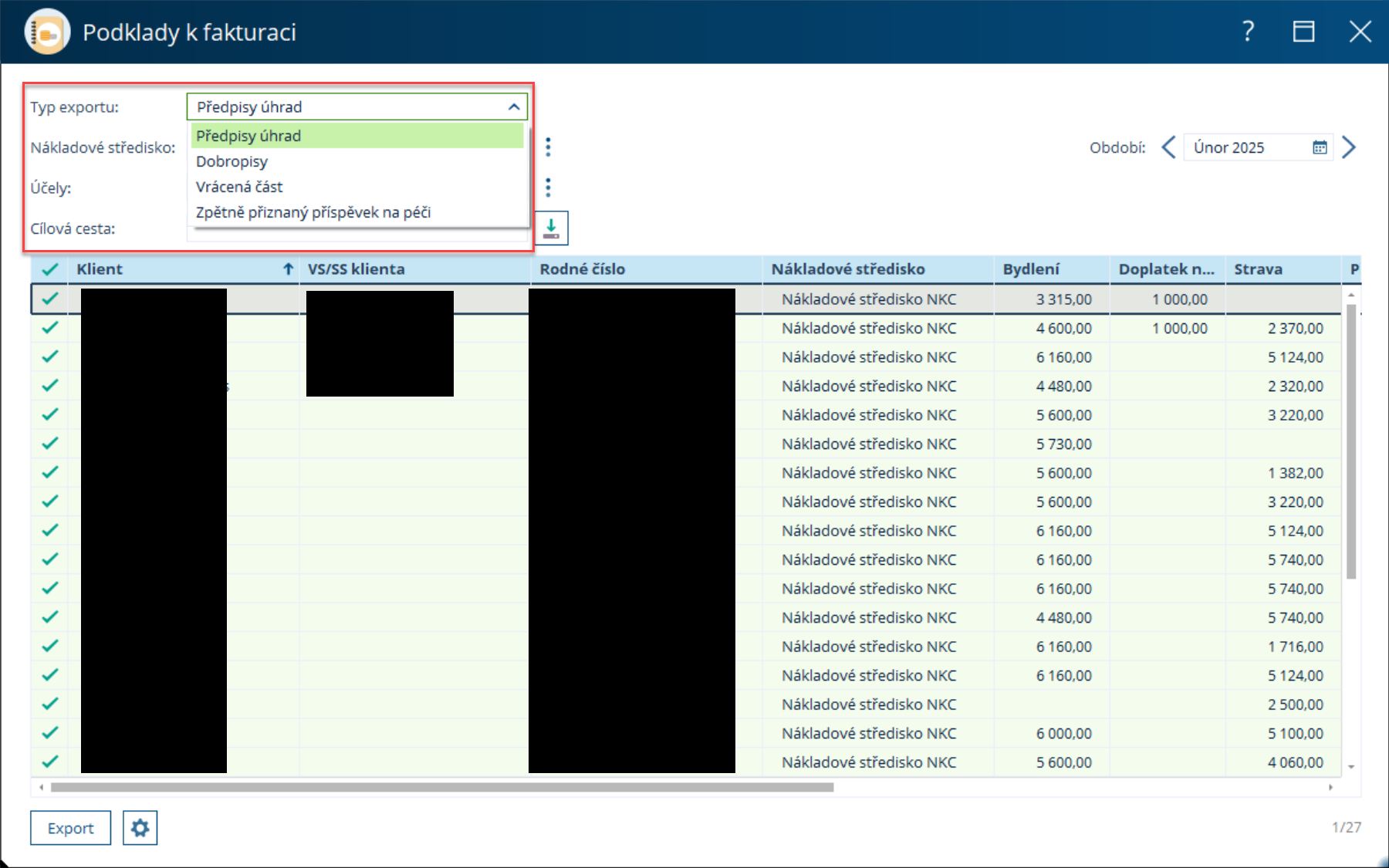 4. Zpětně přiznaný příspěvek na péči - generuje přeplatek pro export u aktivních a bývalých klientů, kterým byl zpětně přiznán PNP. Zohledňuje přijaté platby.