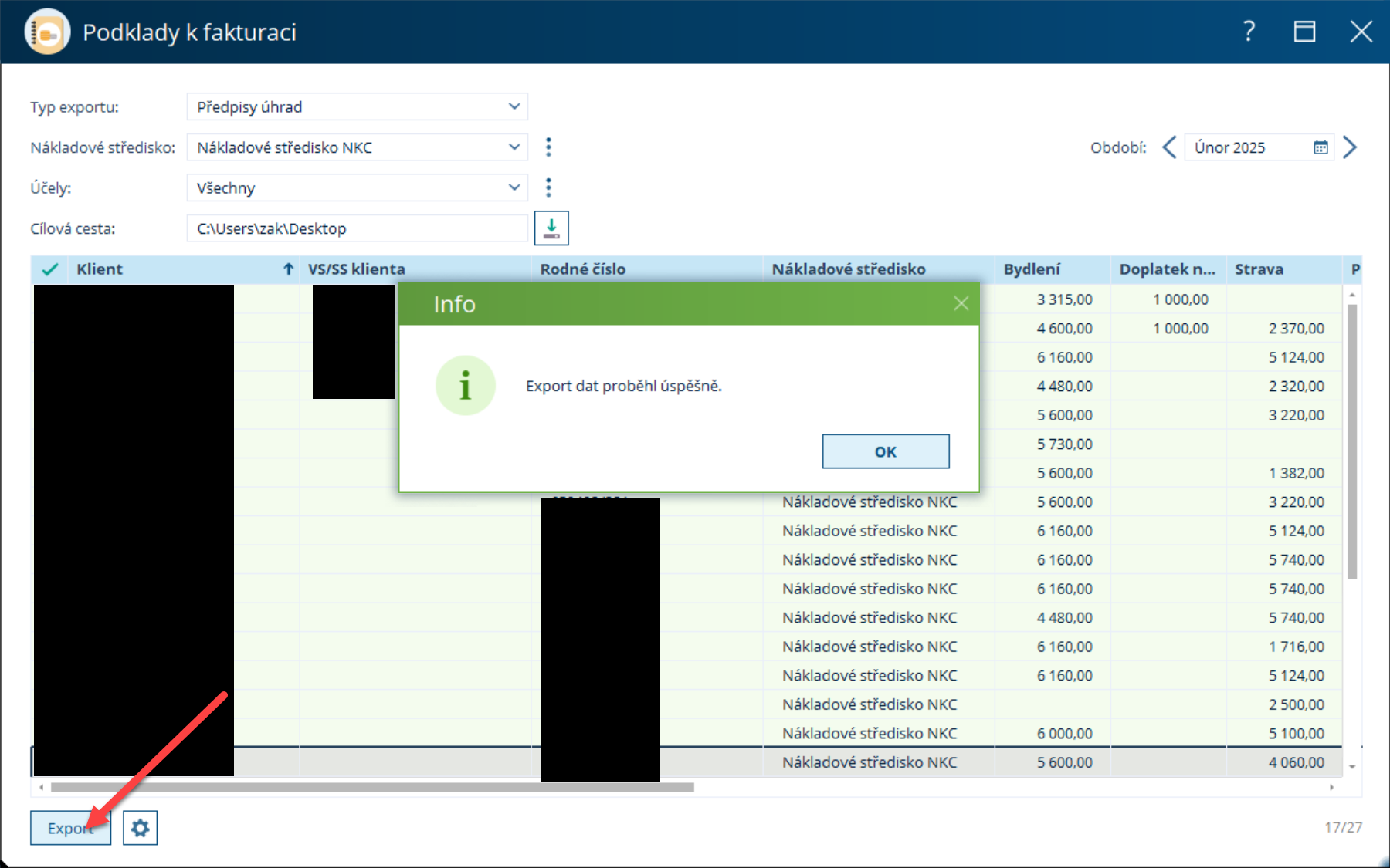 Pokud máte všechno nasataveno, můžete kliknout na tlačítko Export. Zobrazí se hláška o vytvořeném exportu.