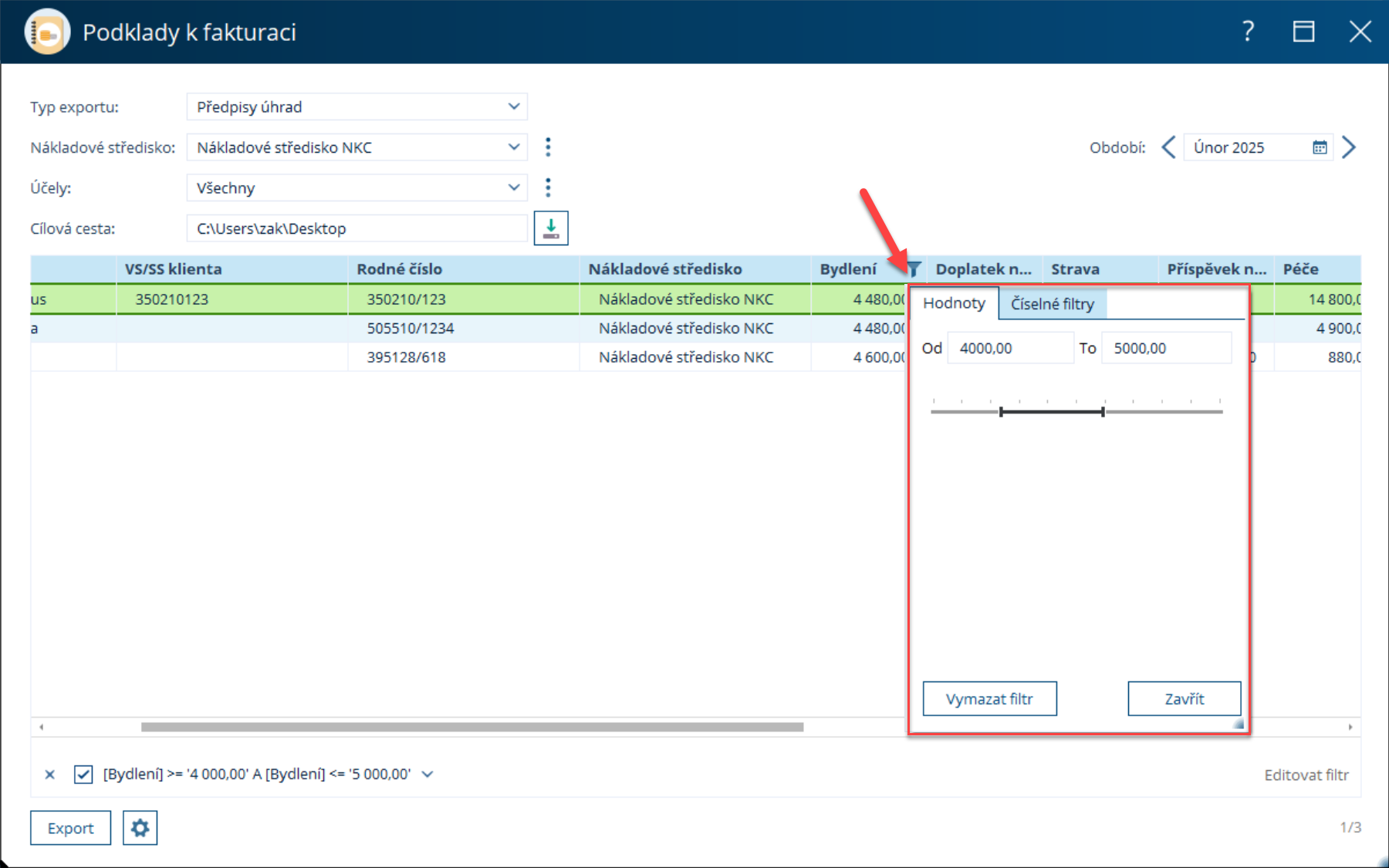 Příklad 1: Zobrazit jen klienty, kteří mají rozpis za bydlení v rozmezí 4000 - 5000,-.