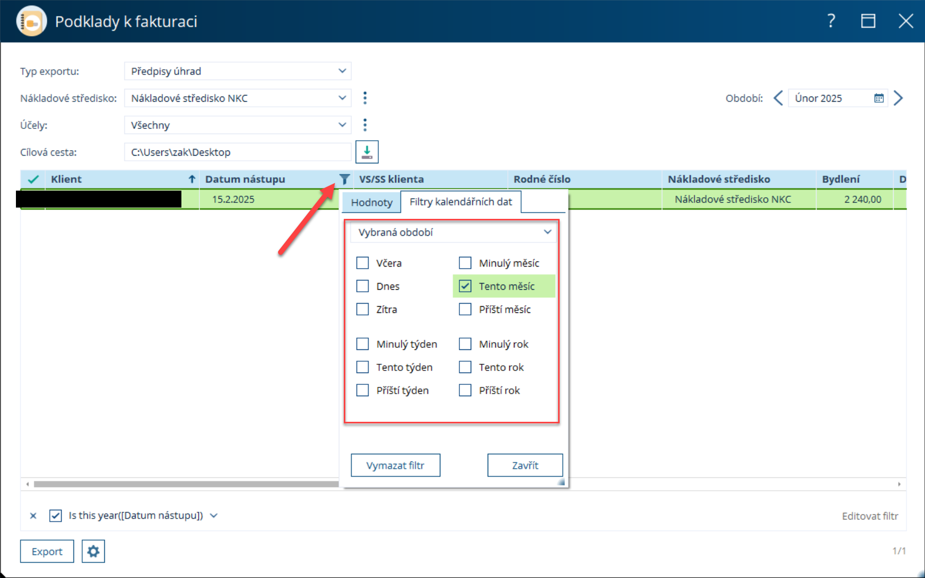 Příklad 2: Chci si vygenerovat export nově nastoupenýách klientů v tomto měsíci.