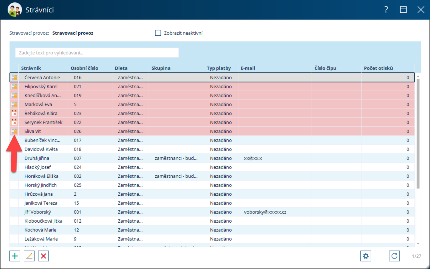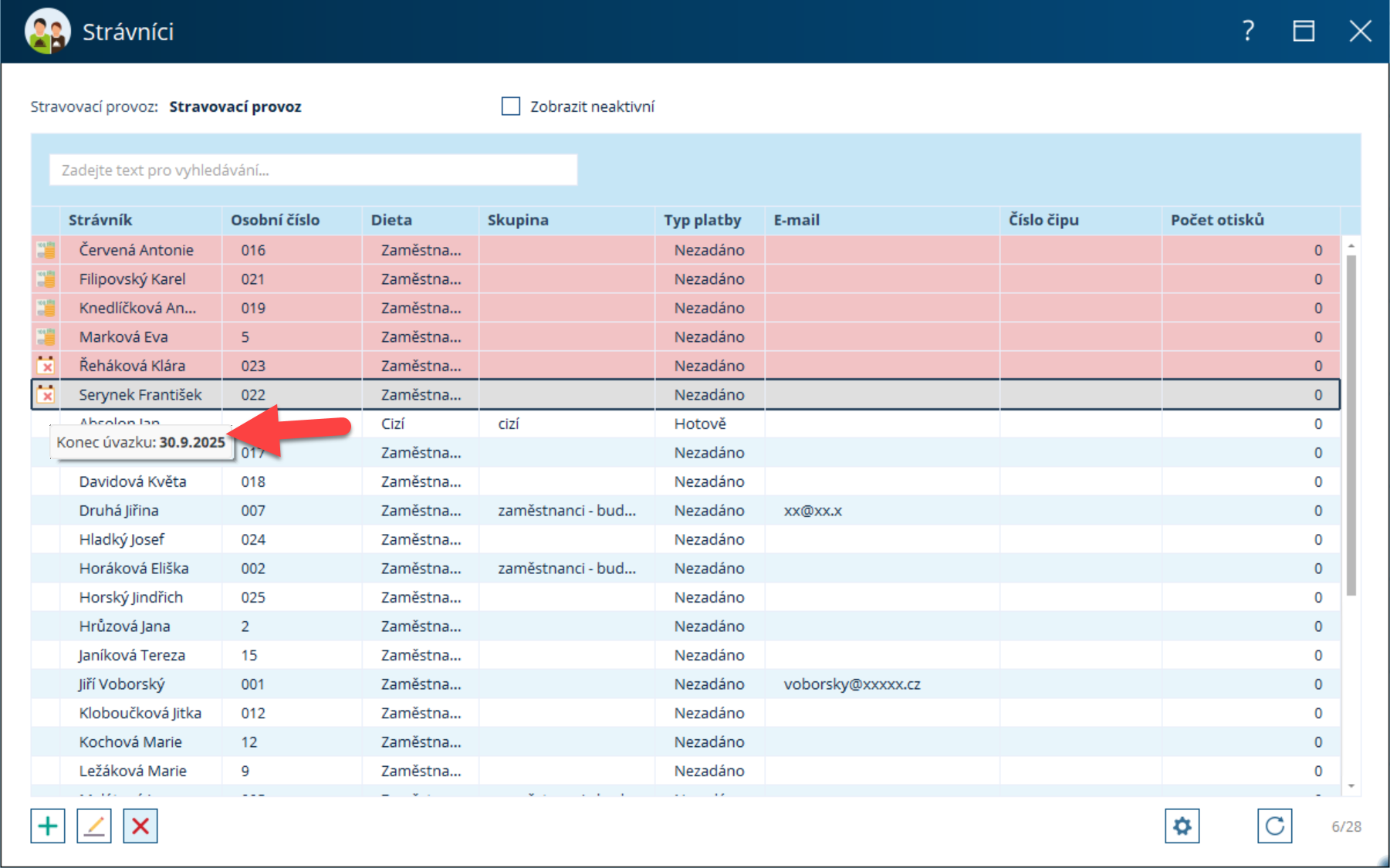 Pokud strávník již nadále nebude odebírat stravu, je vhodné strávníka ze seznamu strávníků odmazat. Týká se to také strávníků - zaměstnanců, kteří již ukončili pracovní poměr. Tito strávníci po skončení poměru z přehledu sami nezmizí, takže je potřeba, abychom je odmazali sami. V přehledu jsou zaměstnanci s ukončeným pracovním poměrem podbarvení červeně a před jménem mají ikonku kalendáře s křížkem. Po najetí myší na ikonku se nám také zobrazí datum, ke kterému mají tito zaměstnanci ukončený poměr.