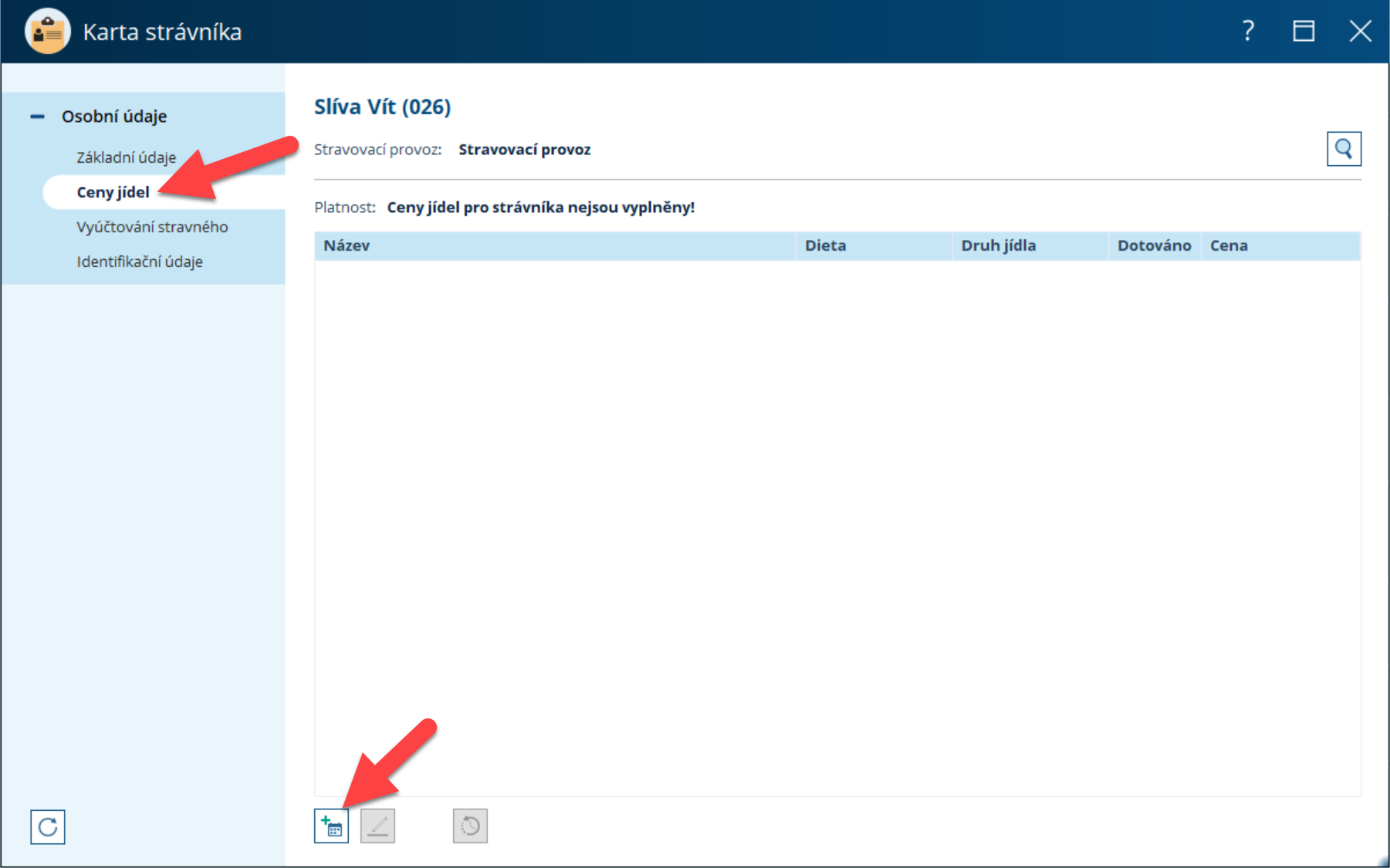 Strávník, který nemá nastavené ceny jídel, se neobjeví v Objednávky - Počty porcí a nebude mu možné žádným způsobem objednat stravu! Vždy tedy musíme strávníkovi pro plnou funkčnost nastavit ceny jídel.