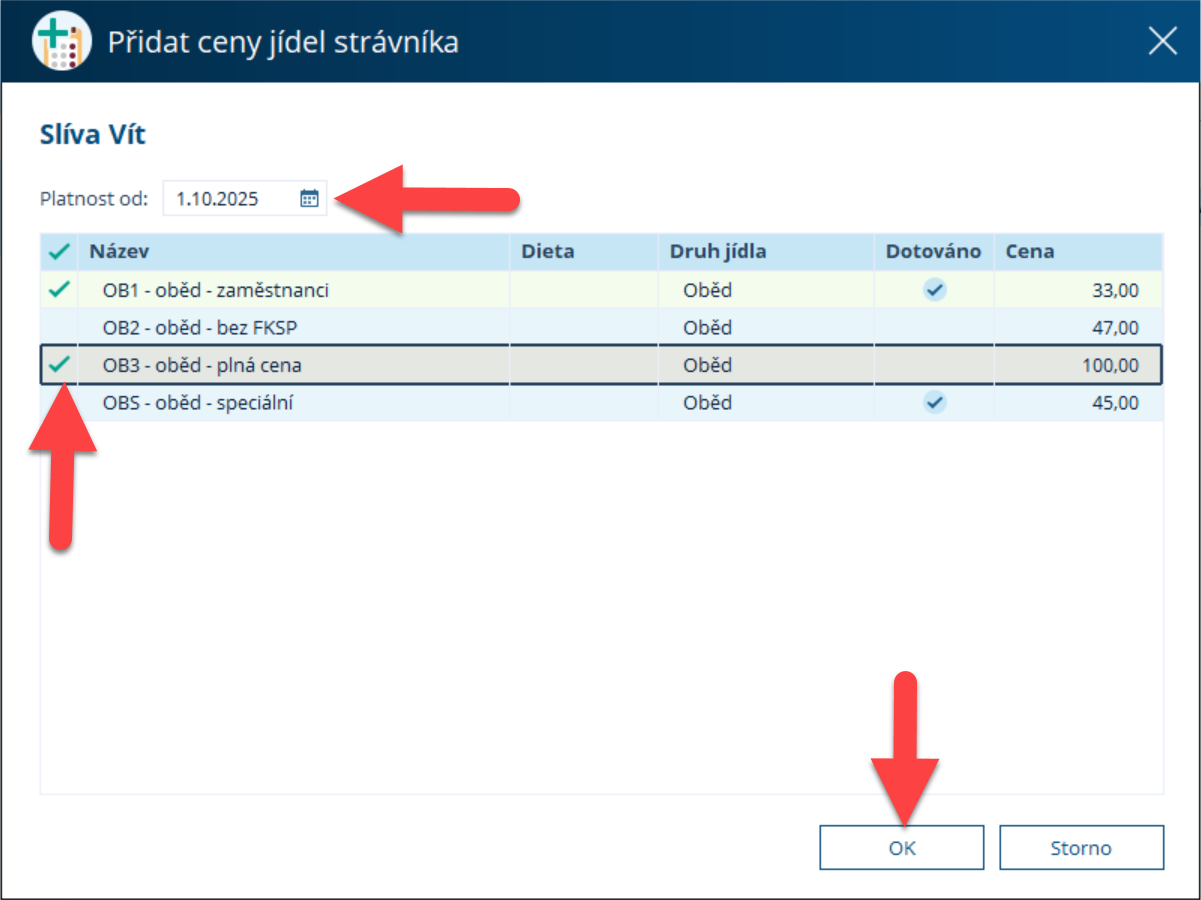 Objeví se nám okno, kde si zvolíme, od kterého data zaměstnanci ceny platí. Od tohoto data také bude možné zaměstnanci objednávat stravu. U nově nastupujících zaměstnanců by tedy toto datum mělo ve většině případů kopírovat datum nástupu. Dále také vybereme ceny jídel, za které můžeme zaměstnanci účtovat stravu. Volbu potvrdíme tlačítkem OK.