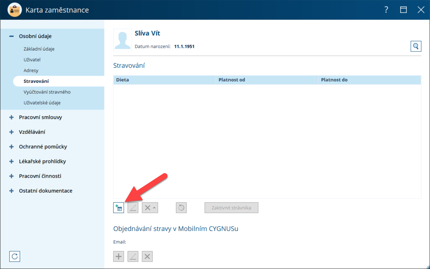 Přejdeme na Kartu zaměstnance. Vidíme, že sekce Stravování je prázdná. Klikneme na ikonu Zadat k datu.