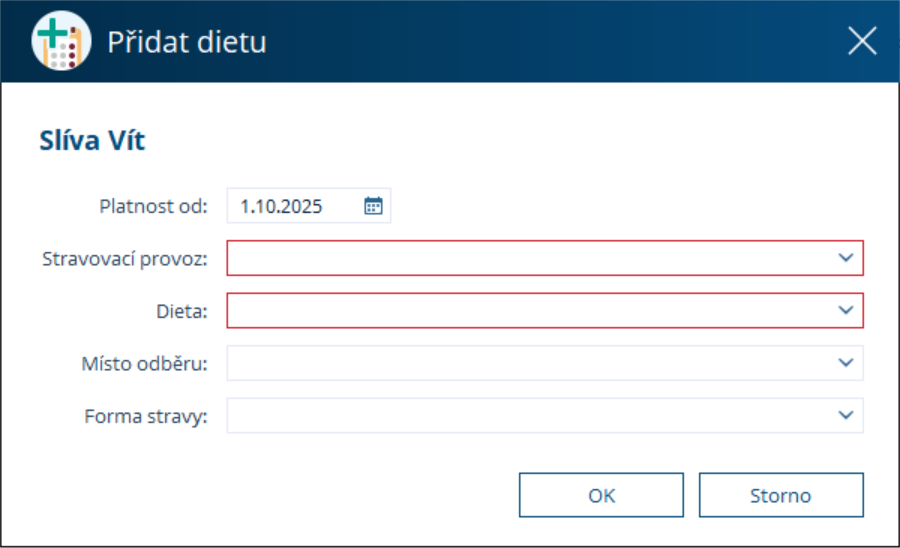 V následujícím okně nastavíme Platnost, Stravovací provoz a Dietu. Navíc také můžeme nastavit další údaje. Poté potvrdíme tlačítkem OK.