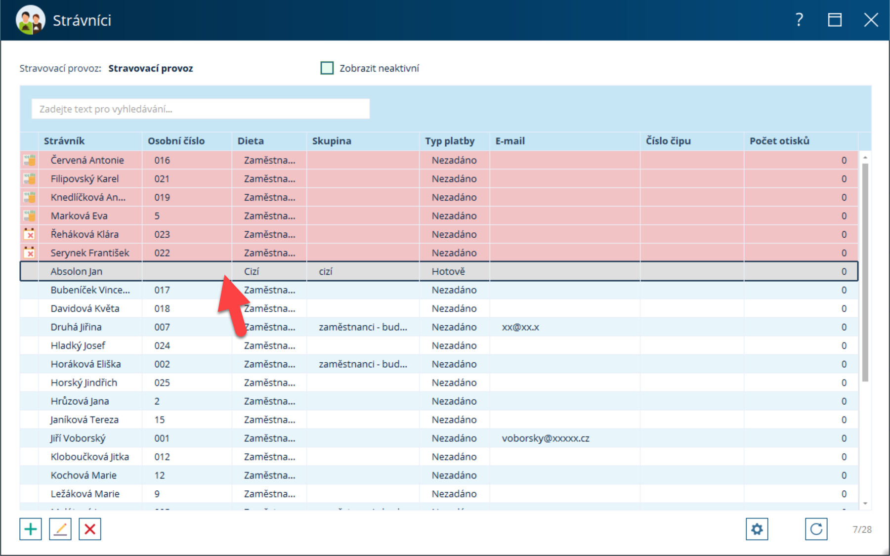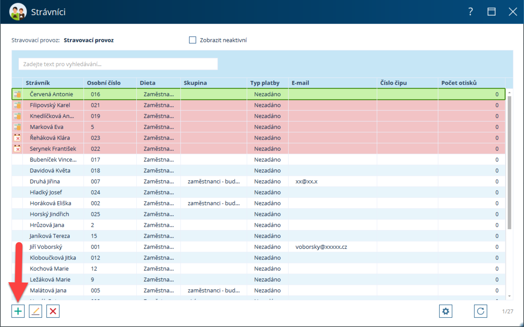Pozor! Nikdy nezakládáme strávníka - zaměstnance pomocí tlačítka Přidat (zelené plus). Tímto způsobem přidáme pouze cizího strávníka. Cizí strávník také nikdy nepůjde přenastavit na strávníka - zaměstnance. Pokud v seznamu strávníků nevidíme nějakého strávníka - zaměstnance, nejdříve zkontrolujeme, zda má nastavený stravovací provoz a dietu na kartě zaměstnance, případně ceny jídel na kartě strávníka.