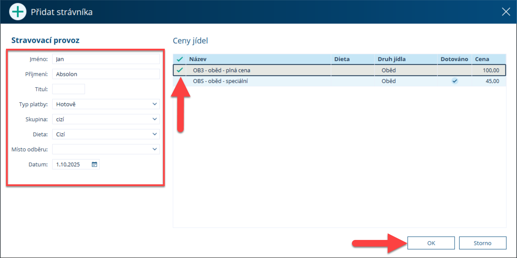 V následujícím okně vyplníme potřebné údaje, ceny jídel, za které strávníkovy budeme stravu účtovat a potvrdíme tlačítkem OK.