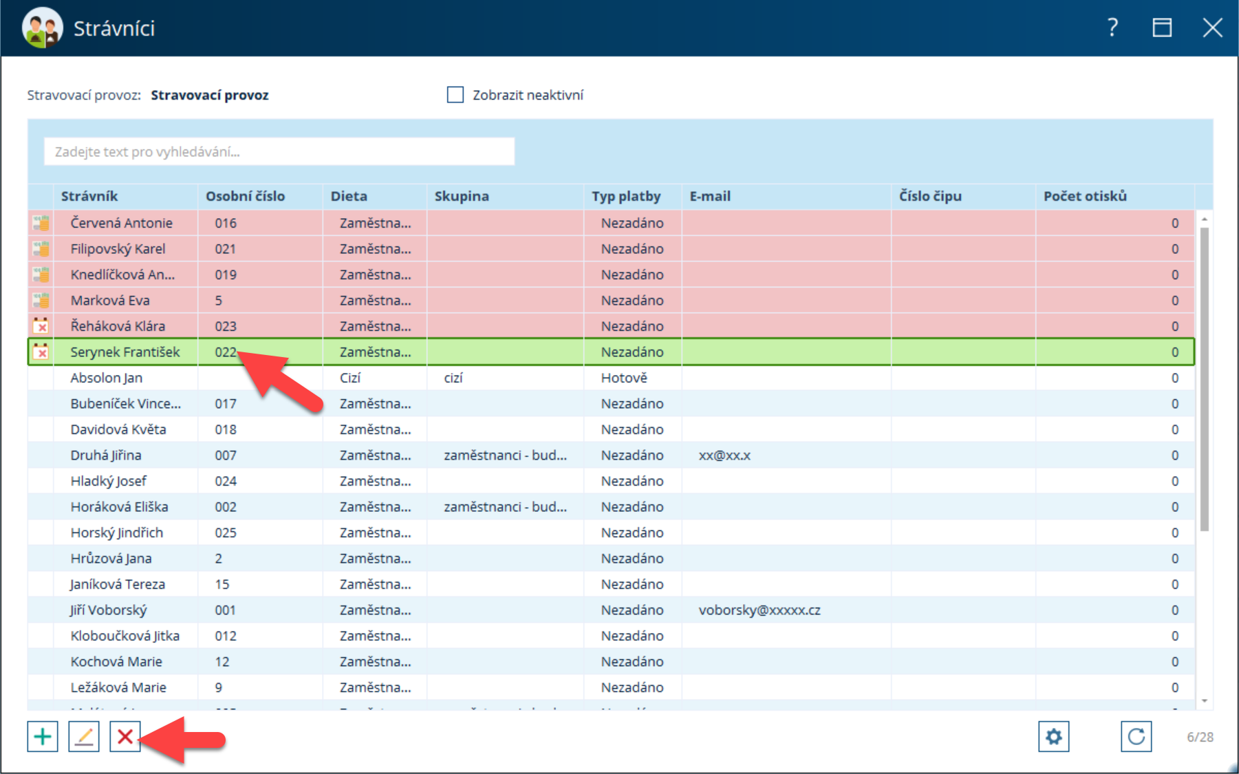 Označíme si strávníka, kterého chceme zneaktivnit a klikneme na tlačítko Odebrat.