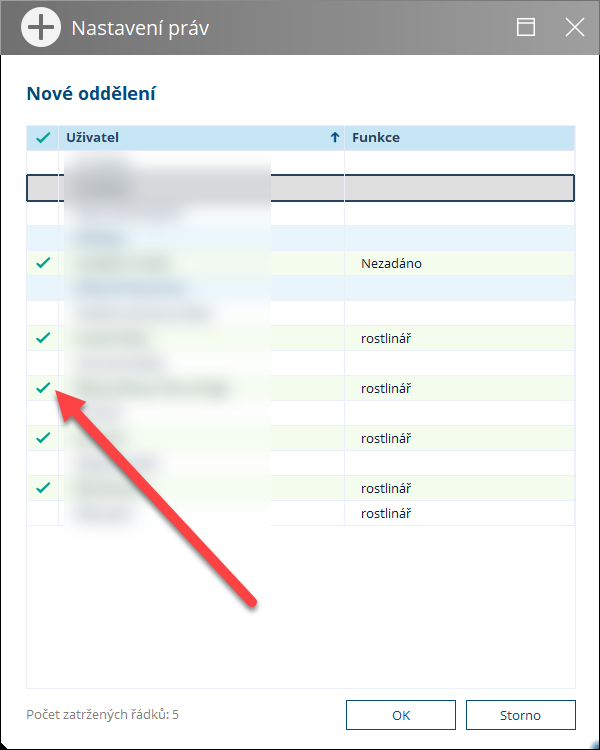 Jste-li současně administrátorem práv, můžete vybrat pracovníky, kteří mají mít přístup ke klientům z toho oddělení. Stačí je zatrhnout a poté potvrdit klepnutím na OK. Práva na nové oddělení můžete zaměstnancům nastavit i později.