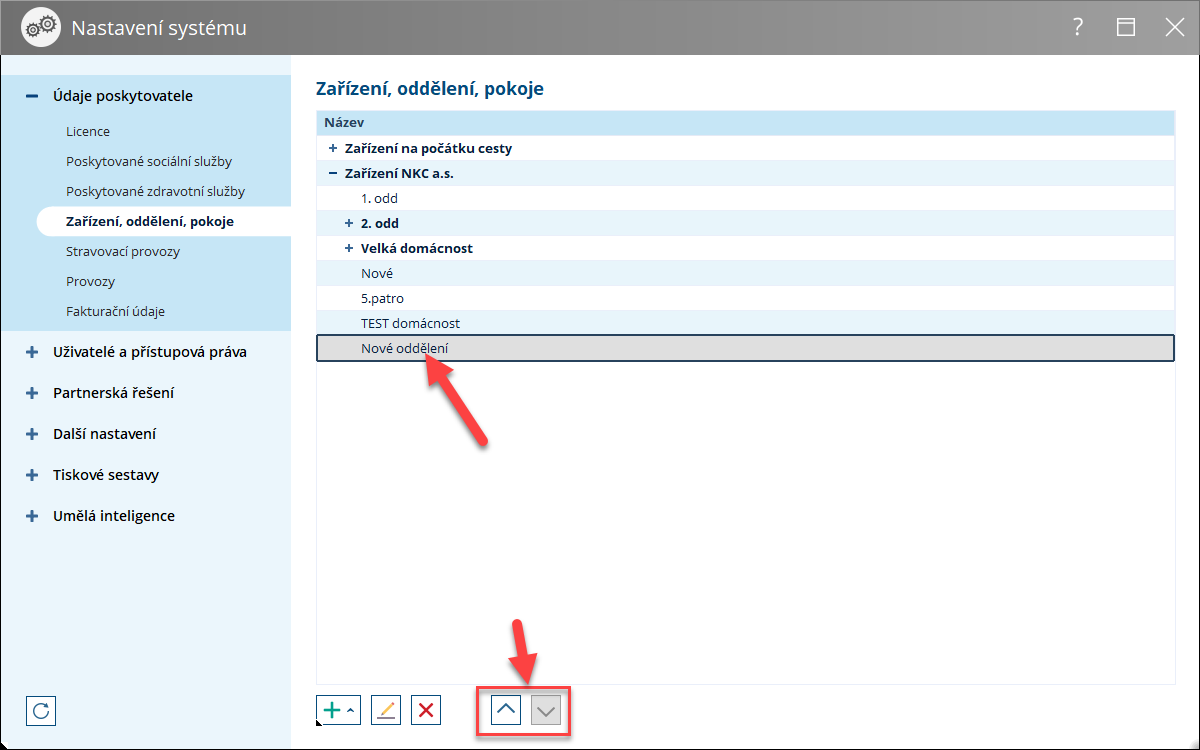 Chcete-li změnit pořadí v odděleních, označte to, které chcete posunout, a pomocí šipek jej posouvejte dle potřeby.