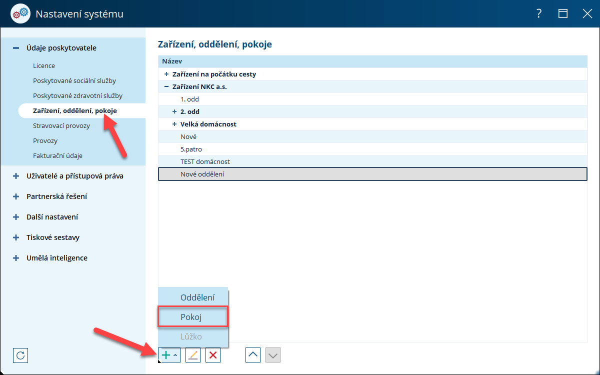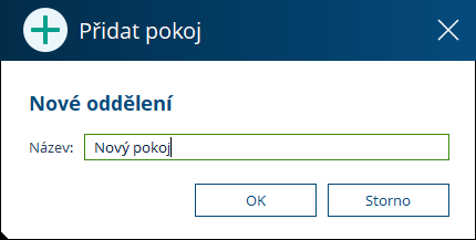 Označte oddělení, kde bude přidáván pokoj, klepněte na tlačítko Přidat a z nabídky zvolte Pokoj.