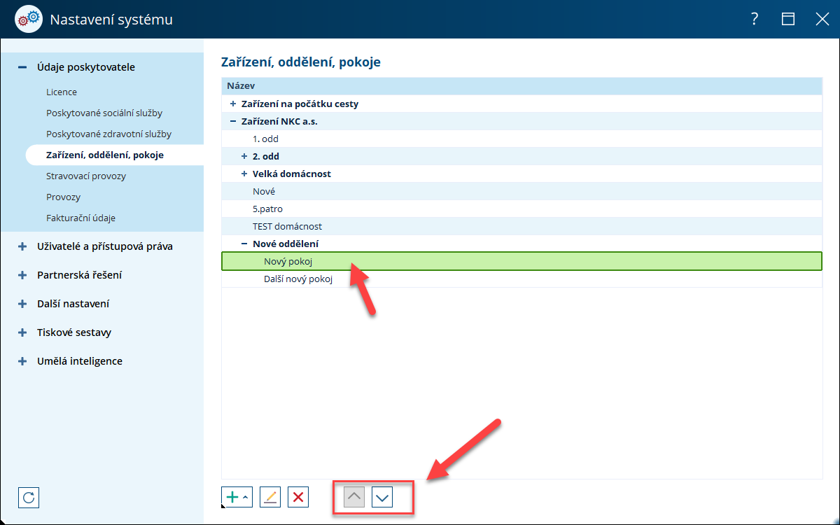 Pořadí v seznamu pokojů pak můžete změnit pomocí šipek.
